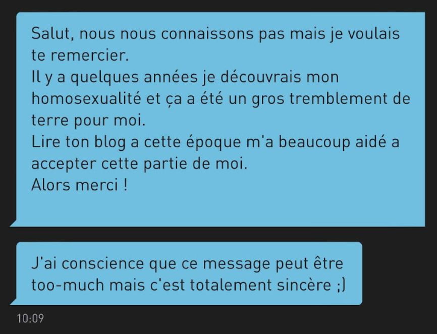 J’ai aussi répondu à des interrogations sur l’homosexualité ou la bissexualité de certains, en aidant de mon mieux, humblement, et parfois juste en discutant candidement. Et aujourd’hui, encore, tous ceux qui étaient jeunots dans ces années, m’envoient parfois des messages pour me remercier de ce qu’ils ont pu apprendre, comprendre ou entreprendre en lisant ces posts à la con.