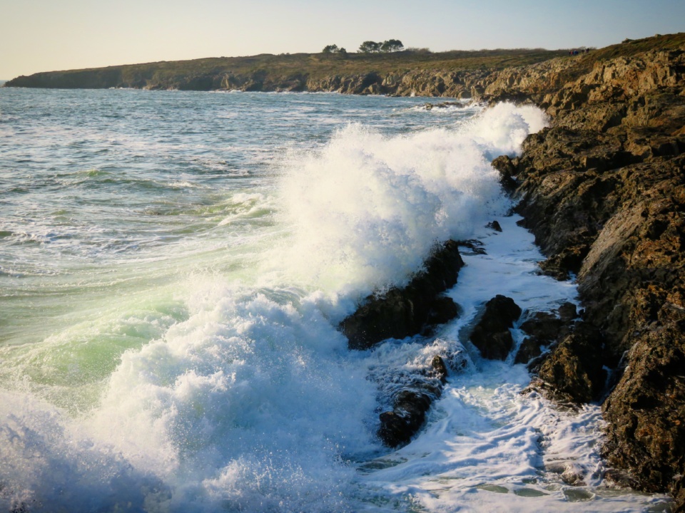 Aujourd’hui, le temps était toujours aussi clément, et les vagues un peu moins fortes, mais avec un tel coefficient (106 là), on finit toujours par avoir un joli spectacle. On est allé au même endroit qu’hier, mais on a parcouru un peu plus loin le chemin côtier pour s’isoler un peu, et on resté jusqu’au coucher de soleil. On a donc rabioté une heure sur le couvre-feu, mais sur un chemin de randonnée vide, en plein vent et avec des transports totalement individuels, j’ai trouvé que ça restait raisonnable. Bref, de toute façon je ne cherche pas du tout à me justifier, ni l’absolution. ^^