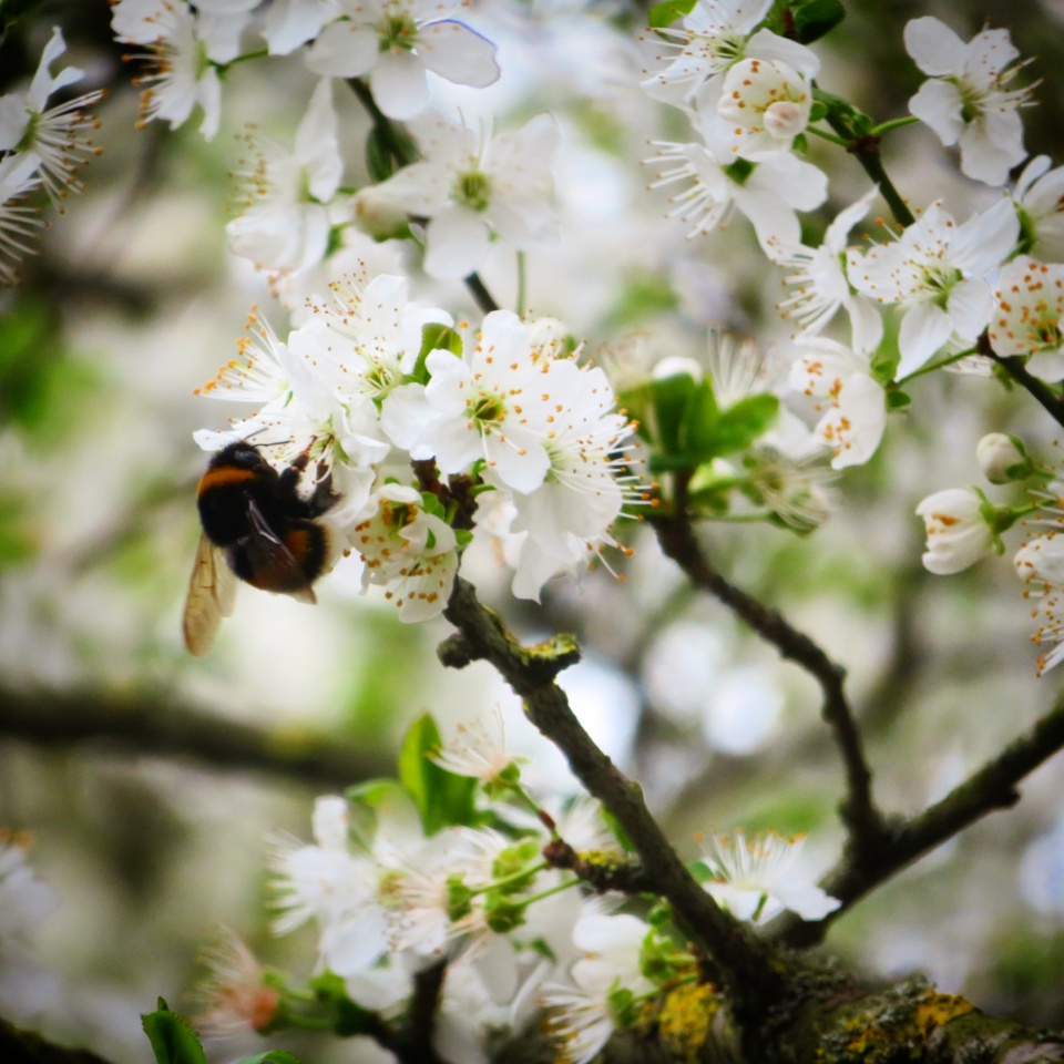 Mais deci delà, des prunus ou des poiriers sont déjà bien en fleurs, et les abeilles ou bourdons ne s’y trompent pas.