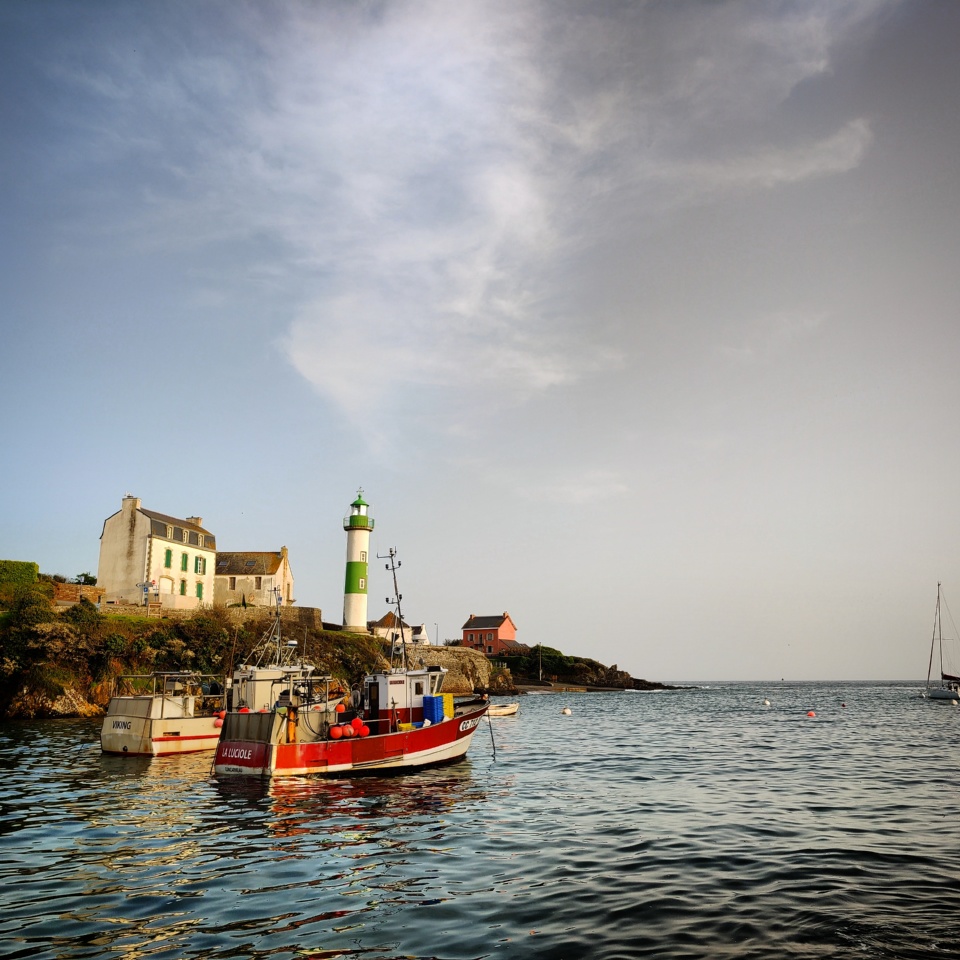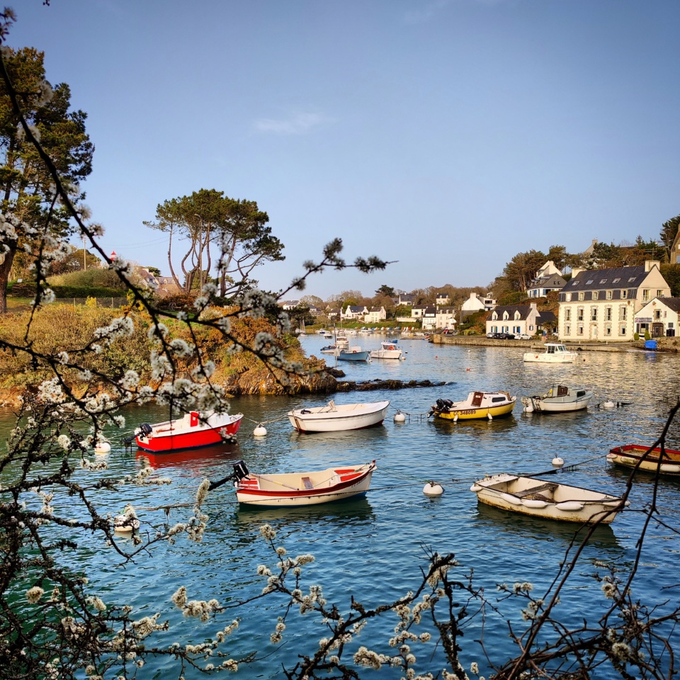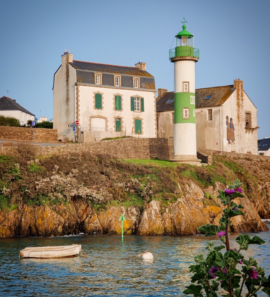 Fin de journée, vers 18h45, après une belle journée ensoleillée mais toujours fraîche de ce printemps balbutiant, un coefficient de 113 (le plus important de cette série de grandes marées), le ciel était voilée par une légère brume qui donnait une teinte étrange aux paysages. Le phare vert, le fameux « Doëlan Aval » (le rouge c’est « Doëlan Amont ») , est toujours aussi photogénique, et sans doute sur toutes les photos souvenirs de ce petit port.