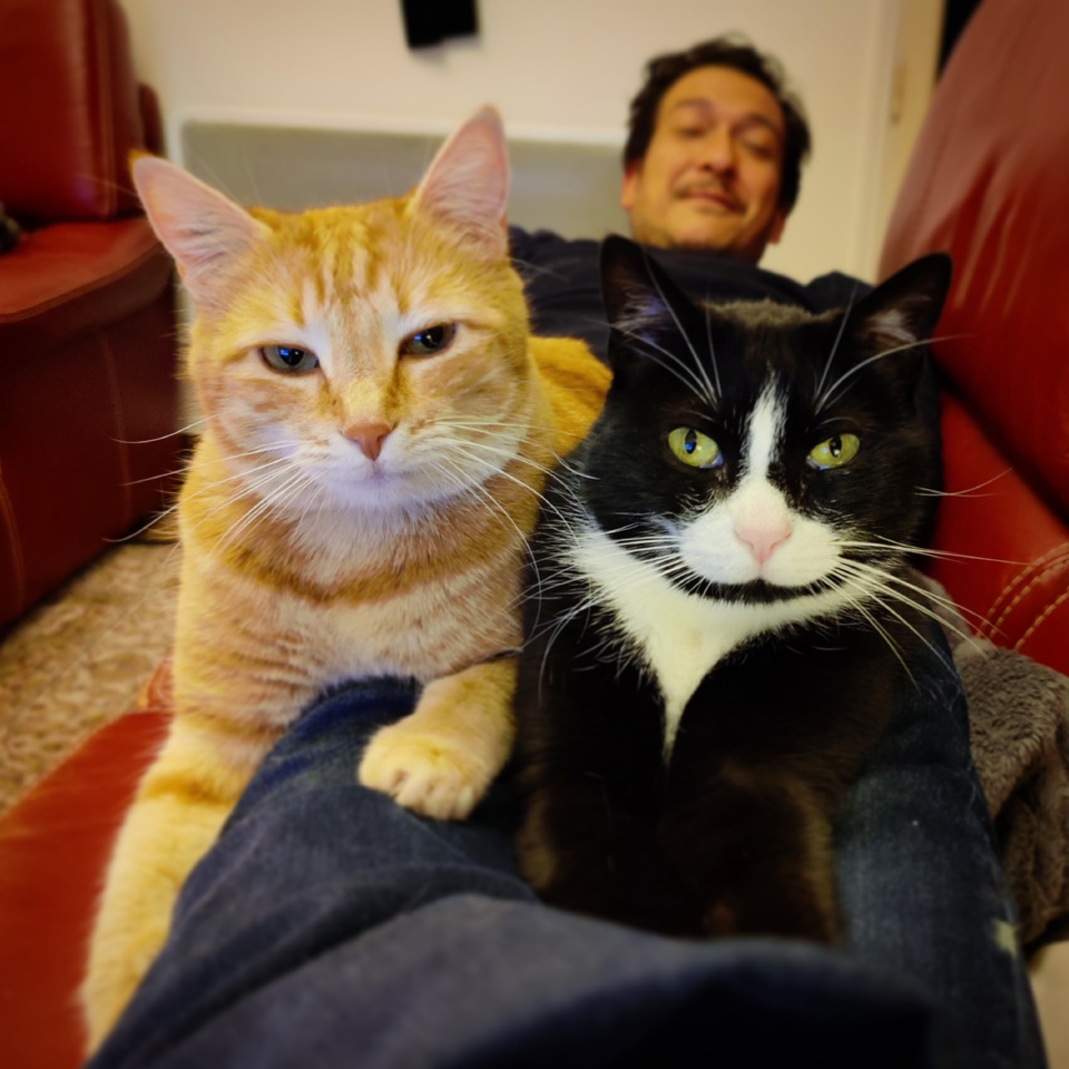 Cela ne dure jamais très longtemps, mais là il se trouve que Sookie s’est mise à ronronner à la présence d’Arya a ses côtés. Cette dernière ne s’est donc pas privée de s’installer sur les genoux de mon cher et tendre. Elle n’en menait pas large, mais ça duré dix bonnes incroyables minutes !!! Evidemment j’ai immortalisé cette singulière et exceptionnelle conjonction planétaire.