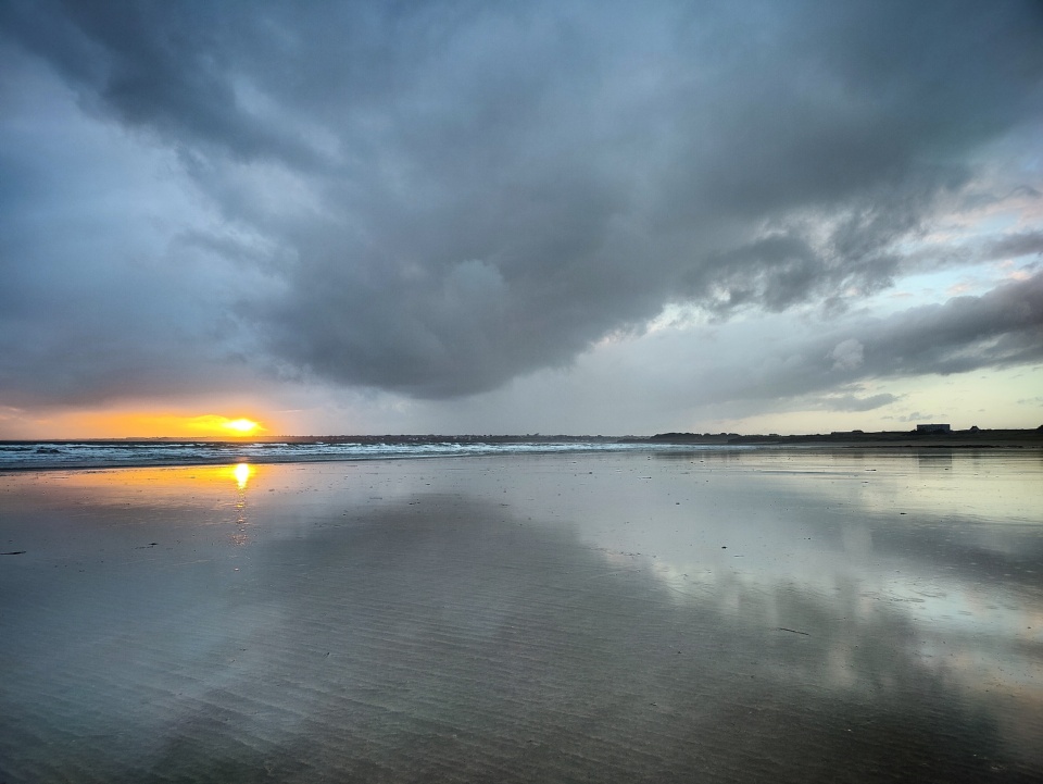 Et c’est ce soir, que j’ai traversé la Laïta pour me rendre dans le Morbihan. Avec un coefficient de marée assez fort (86) et un horaire de coucher de soleil qui coïncide avec la marée basse, j’étais sûr de trouver à Fort-Bloqué un magnifique miroir d’eau et quelques nuages. Bon, en réalité c’était BEAUCOUP de nuages, et même pas mal de pluie, mais je ne me suis pas découragé.