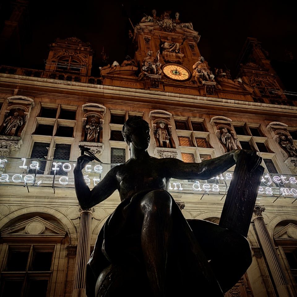 Et en cheminant tranquillement, je me suis arrêté devant l’Hôtel de Ville qui a un texte en néon sur sa devanture que je n’avais jamais vu. Il s’agit d’une phrase de Simone Veil.
