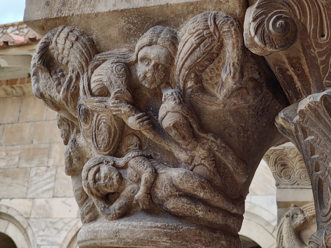 Le plus intéressant ça reste le cloître qui est directement connecté et accessible par la cathédrale (ou réciproquement puisqu’on entre en réalité par le cloître aujourd’hui). Il est également emblématique par sa beauté (il est tout en marbre blanc de Céret) mais aussi parce qu’il est un modèle du genre : « chaque galerie compte cinq piliers quadrangulaires et huit colonnes géminées réunies par des arcs en plein cintre« . J’avais visité ça avec mes parents quand j’avais une douzaine d’années, et je me rappelle avoir vraiment adoré les explications du guide sur les scènes bibliques sculptées sur les chapiteaux (ou les impostes des piliers1).