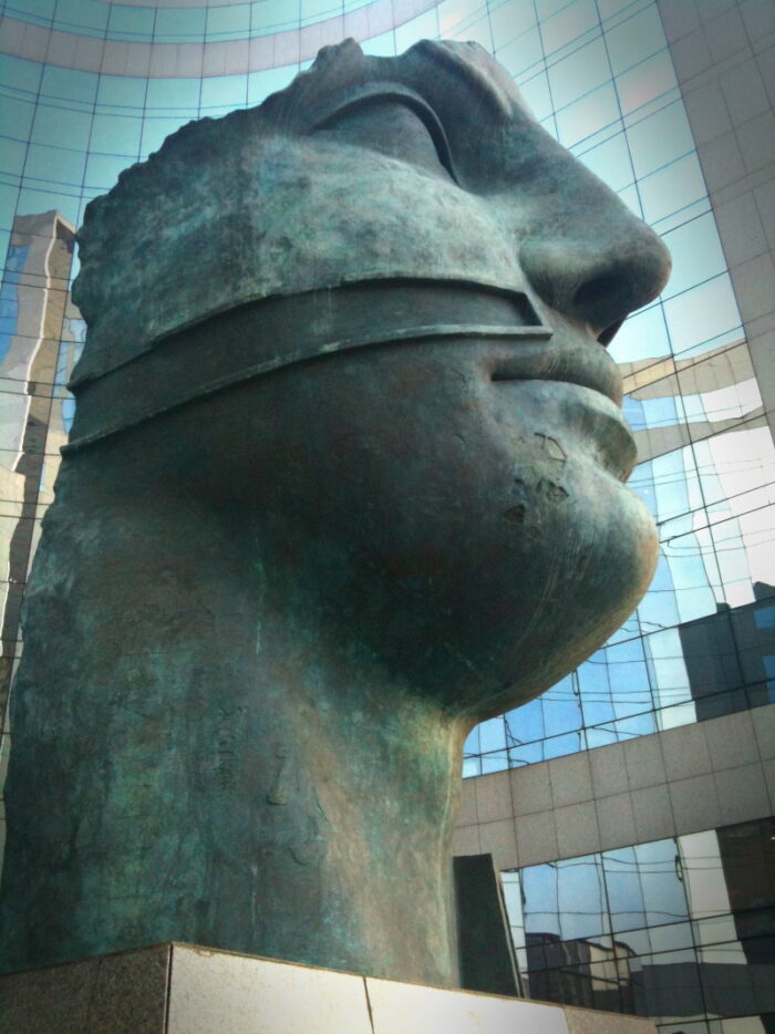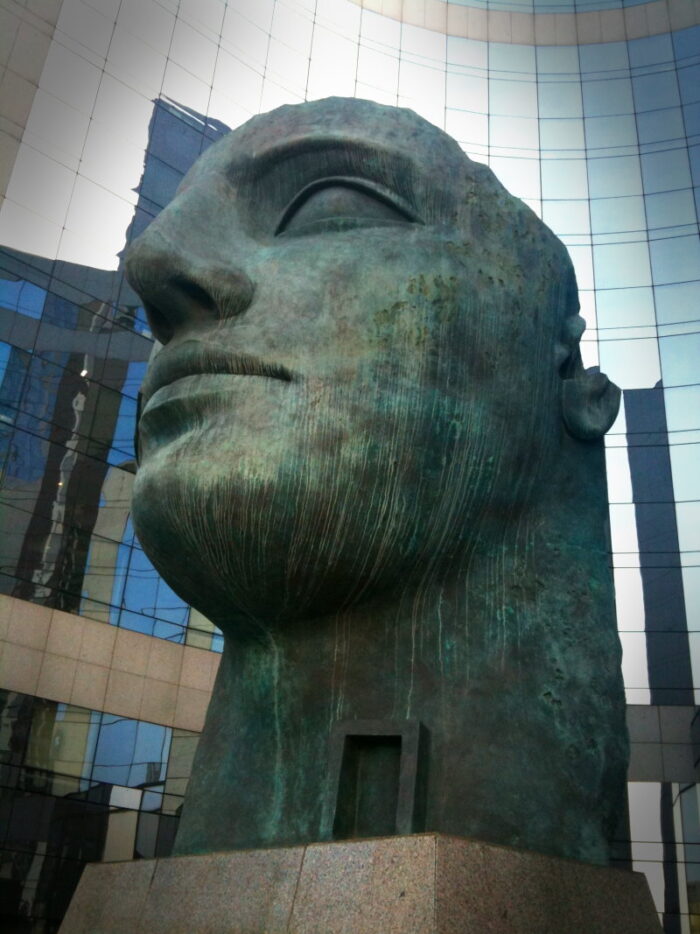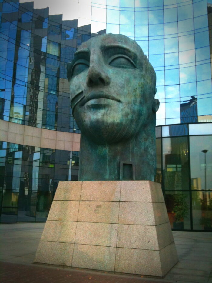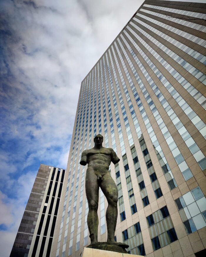 Et vers le CNIT, il y a ces deux autres sculptures monumentales et mythologiques d’Igor Mitoraj. Il s’agit d’Icare (1999), mais qui est assez étrange parce qu’il n’y a pas vraiment détails qui rappellent le mythe (notamment les ailes). Mais la position et la taille de l’œuvre devant un building a vraiment une présence assez incroyable et puissante.