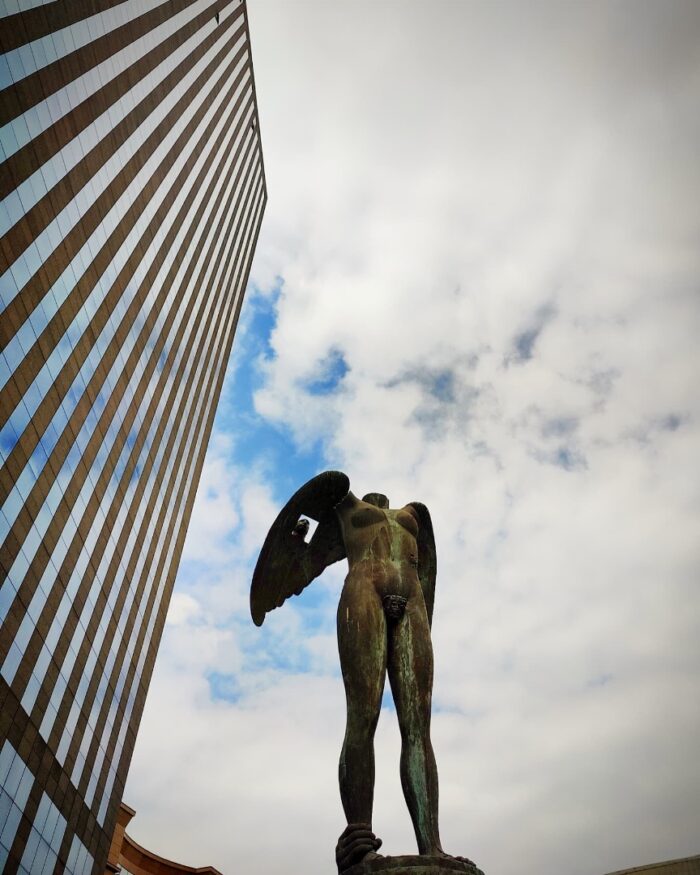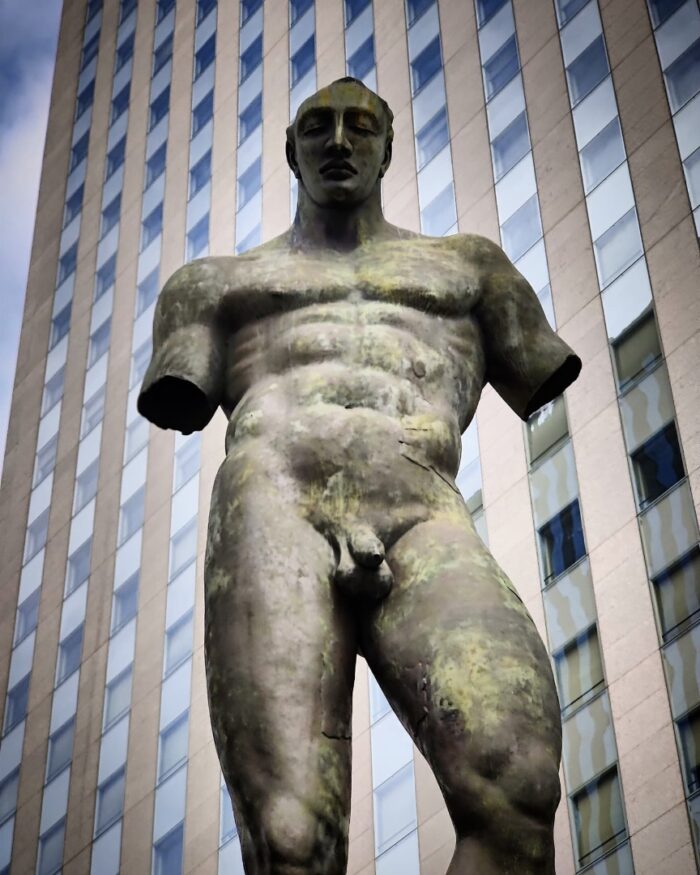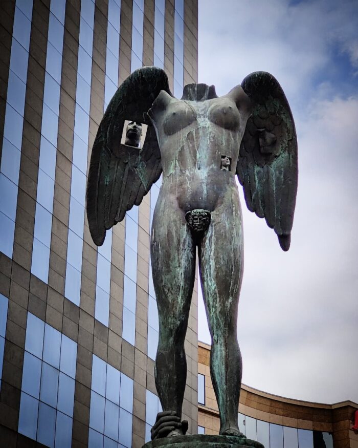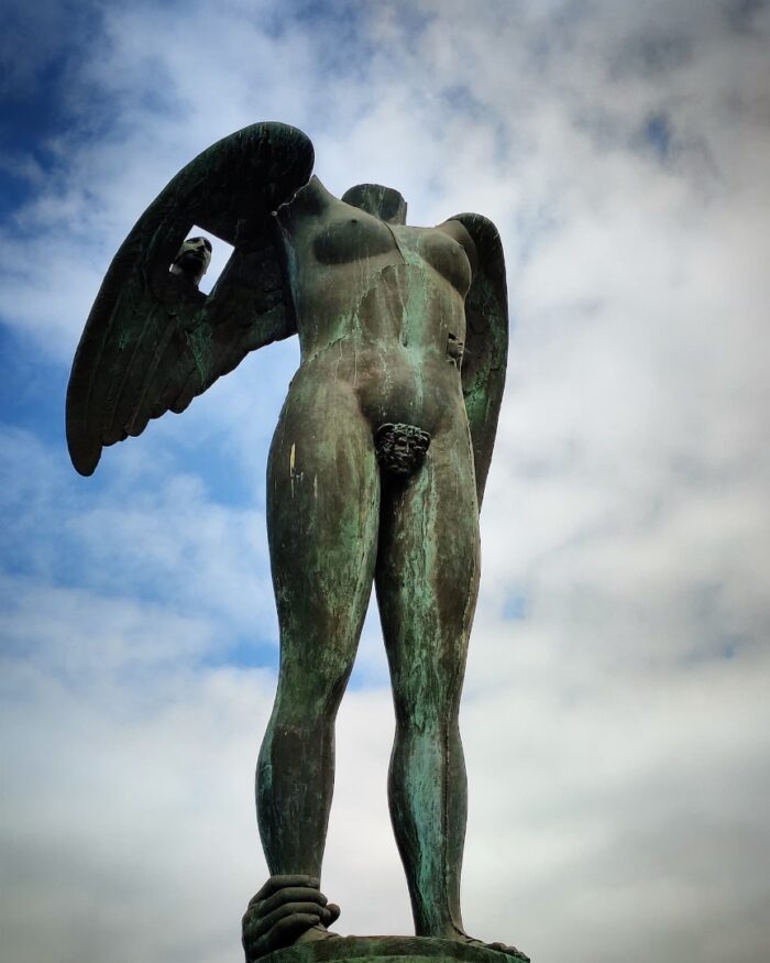 A quelques mètres de là c’est Ikaria (2000), donc encore Icare mais là c’est drôle car c’est l’opposé de l’autre sculpture, c’est-à-dire qu’on a presque trop de détails et de métaphores pour expliquer le mythe. Il y a cette statue étêtée déjà, et cette main à son pied qui l’empêche de décoller. Mais aussi cette tête découpée dans un carré sur une aile, ou son cache-sexe en forme de personnage antique, food for thought comme on dit.