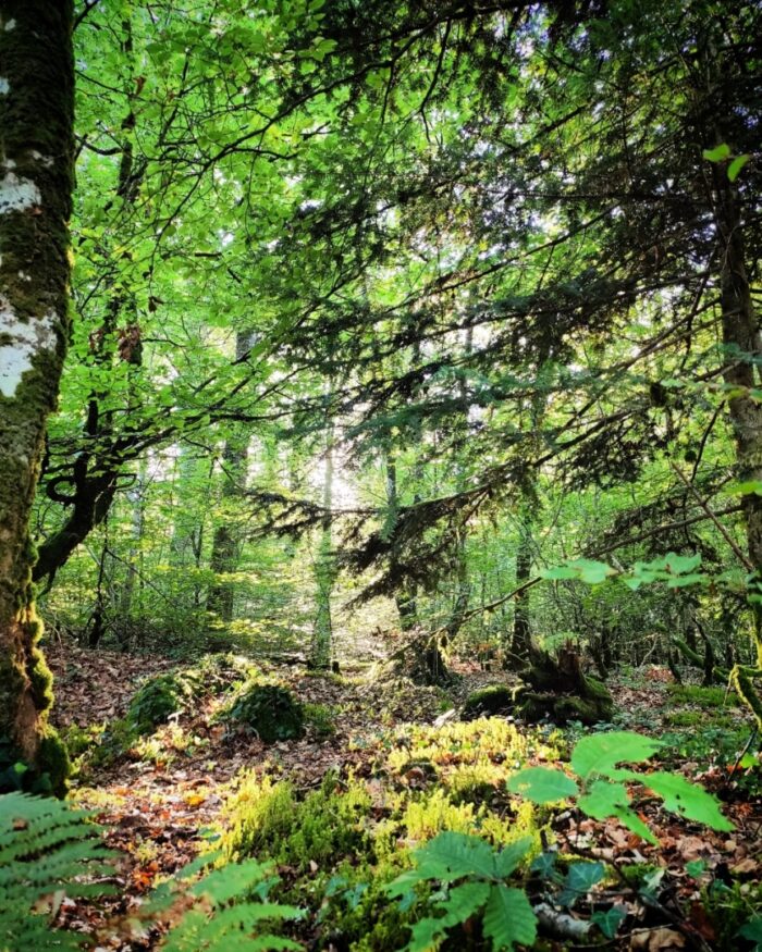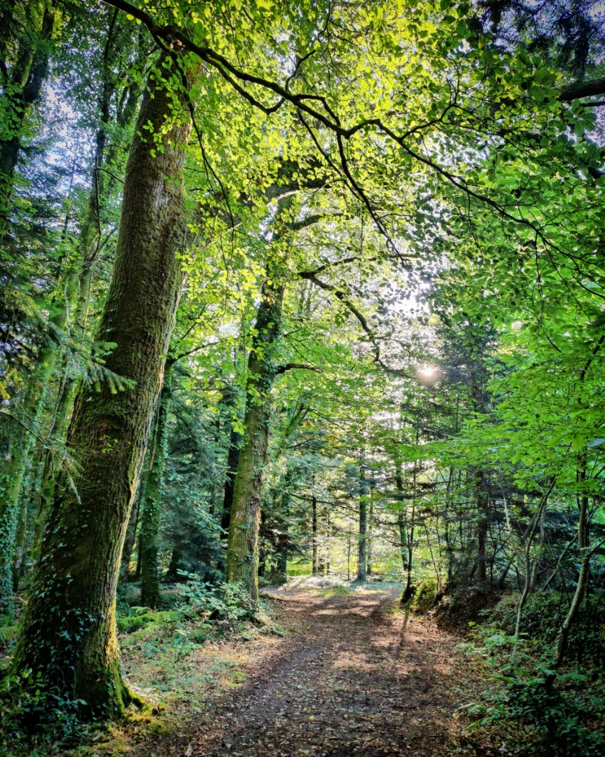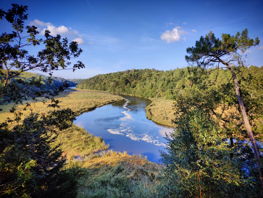 Bien sûr, la forêt et l’océan tout proche ont un point commun : la Laïta qui coule depuis Quimperlé. En continuant à pédaler en plein cœur de la forêt, on tombe sur le pré Mathurin et ce point de vue splendide un peu en hauteur.