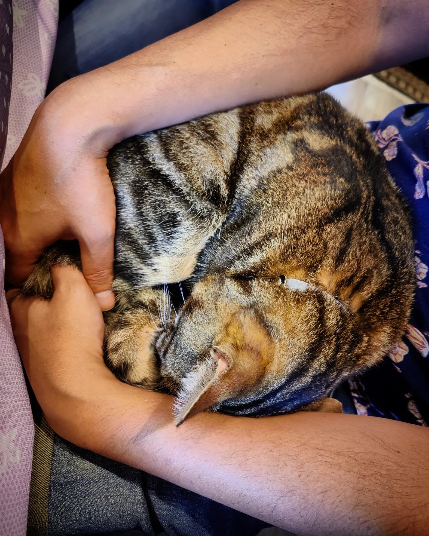 Il s’est laissé faire par chéri qui l’a mis sur ses genoux, et cédant à ses caresses il s’est carrément endormi. ^^