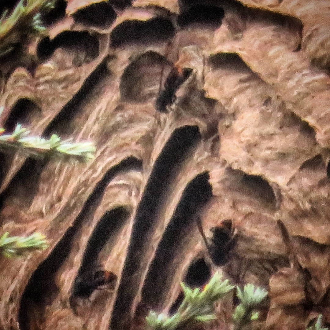 Je me demande comment le mari a bien pu apercevoir le nid, mais dès qu’il me l’a montré, j’ai halluciné sur sa taille. Il est énoooorme !! J’ai pris mon appareil photo pour zoomer et me rendre mieux compte de ce que c’est, et peut-être pouvoir déterminer le type d’hyménoptères à qui nous avons à faire.
