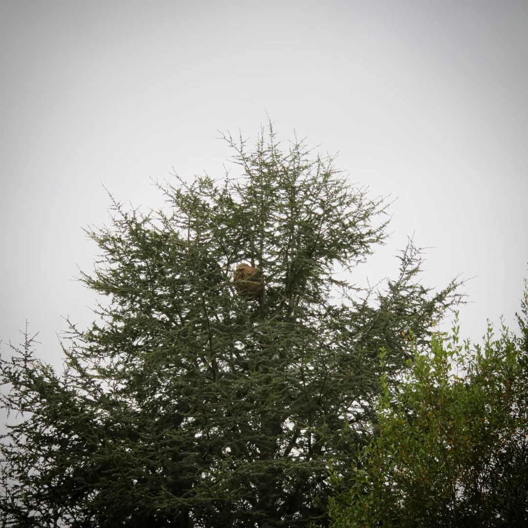 Je me demande comment le mari a bien pu apercevoir le nid, mais dès qu’il me l’a montré, j’ai halluciné sur sa taille. Il est énoooorme !! J’ai pris mon appareil photo pour zoomer et me rendre mieux compte de ce que c’est, et peut-être pouvoir déterminer le type d’hyménoptères à qui nous avons à faire.