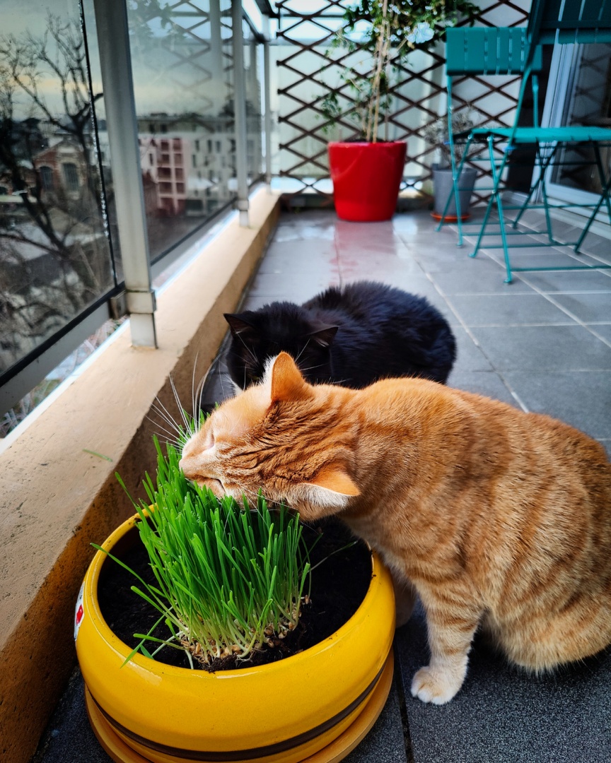 Avec ce temps froid, l’herbe à chat est la seule raison pour laquelle on arrive à les faire sortir quelques minutes sur le balcon.