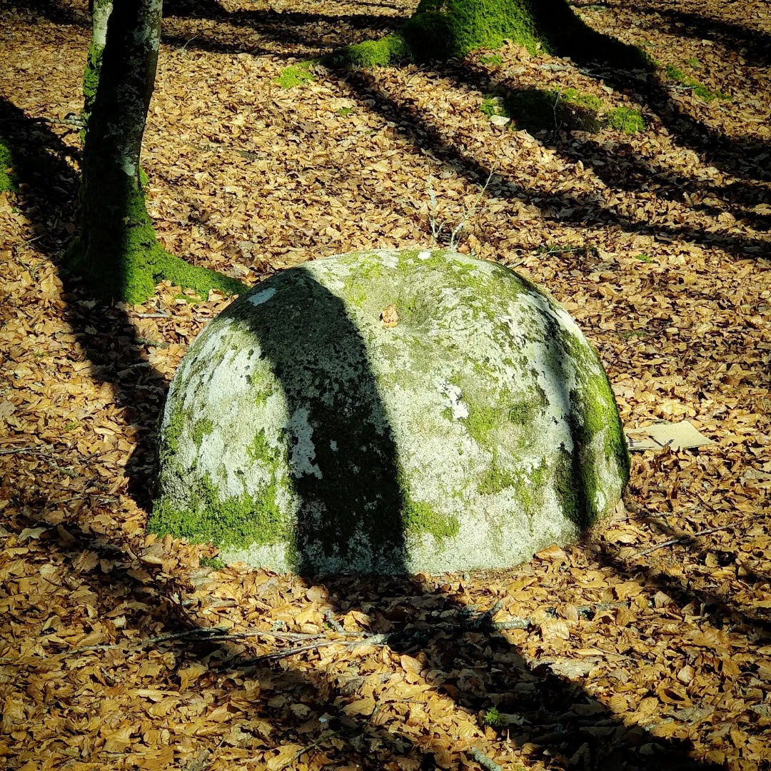 Et un peu plus haut, en pleine forêt, il y a cette stèle de l’âge de Fer, la stèle de Kerguégen, qui est apparemment une pierre qui a été déplacée d’une nécropole inconnue, et qui est couverte de cupules chrétiennes (à priori).