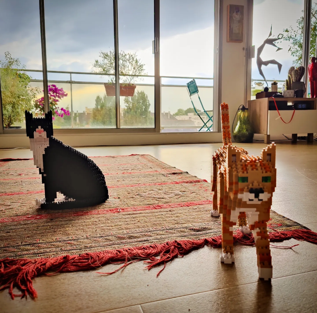 Lundi soir, Sookie et Arya posaient toutes mignonnes au soleil, et j’ai voulu les photographier. Mais évidemment dès que je m’intéresse à elles et que je pointe mon téléphone : Arya vient pour se faire caresser et ronronner dans mes jambes, Sookie se fige, se renfrogne et juge. Hu hu hu. Mais le lendemain, mon regard tombe sur les répliques en briques des chatounettes, et j’ai une révélation !! Elles avaient exactement la même position !!! Mouahahahaha.