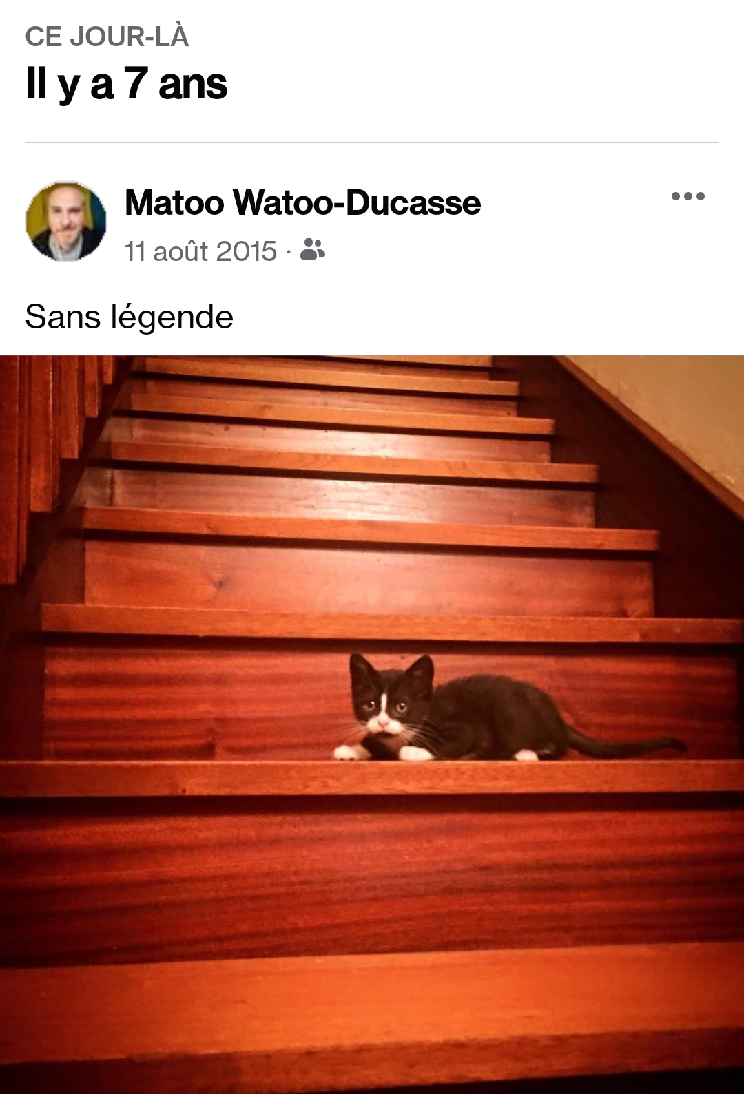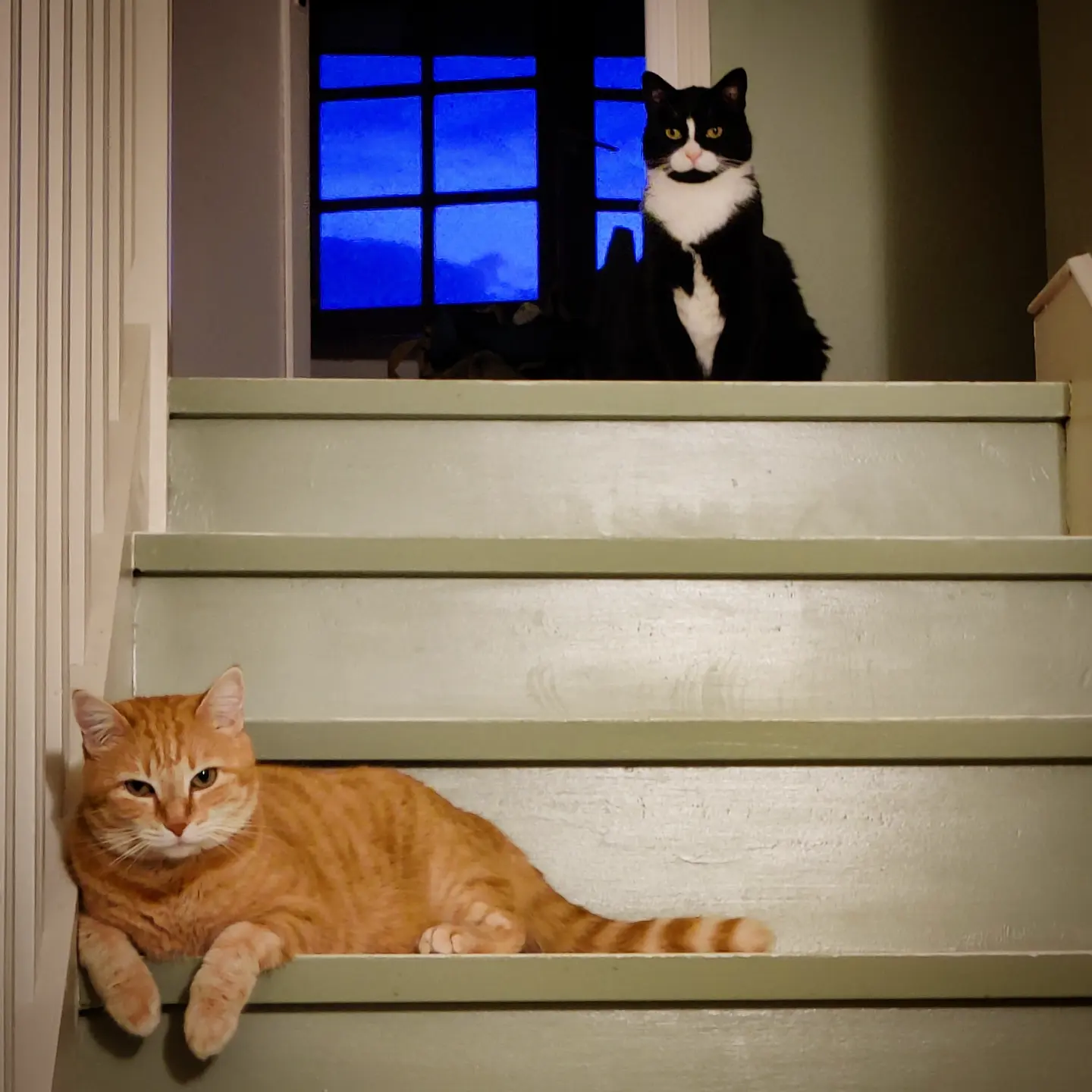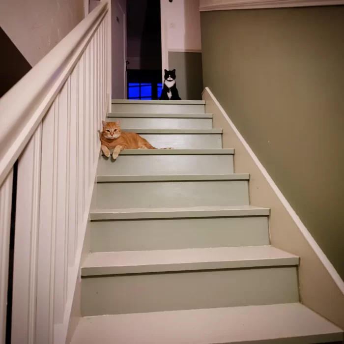 Mais ce qui est encore plus drôle, c’est de voir cette photo de la même semaine sept ans plus tard, alors qu’on rentrait d’un dîner. Mouahahahaha. Maintenant elles sont deux, et elles nous attendaient de pied ferme !!!! (Ah oui, on a repeint l’escalier.