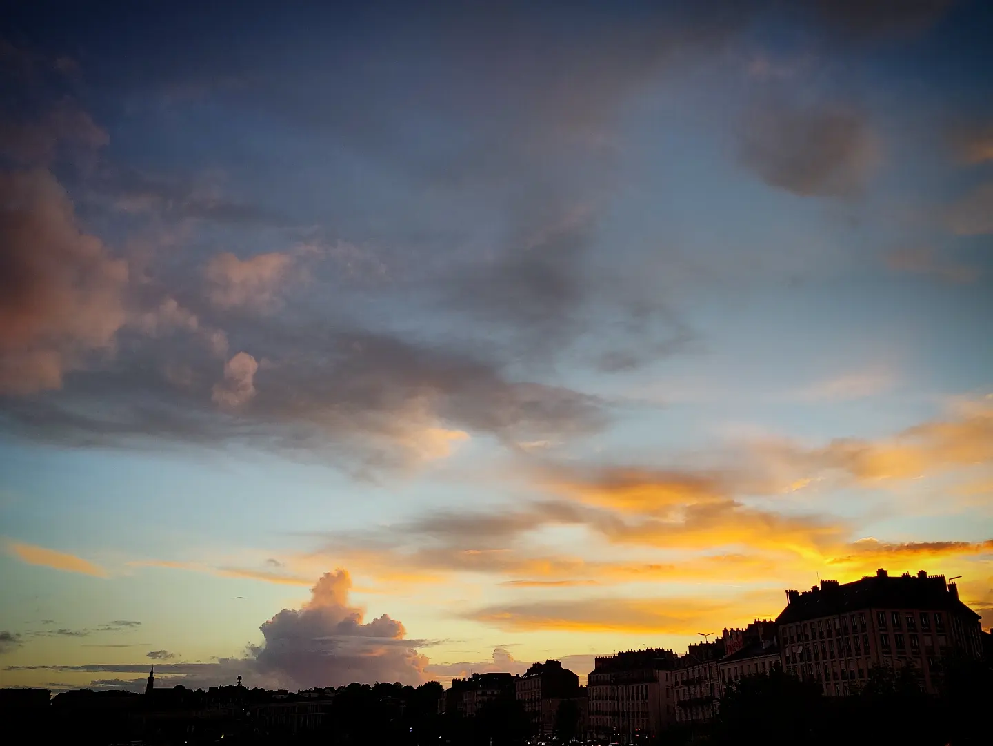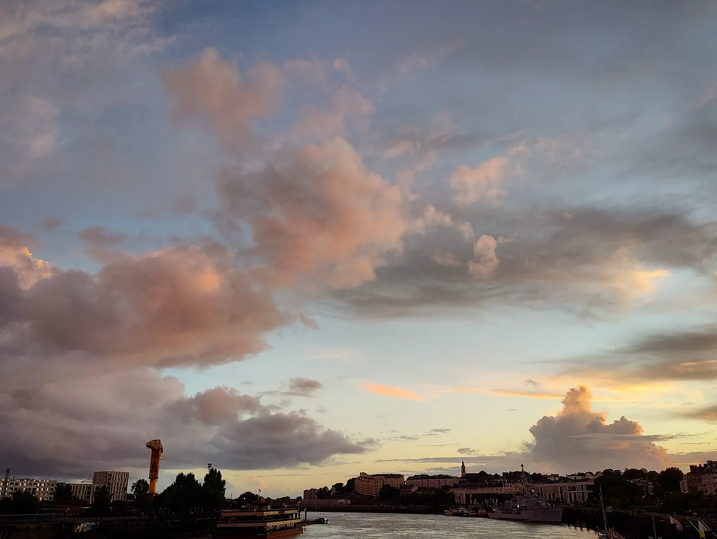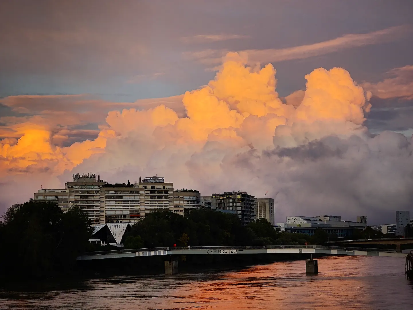 Bah oui, y’a pas à dire un ciel n’est jamais aussi beau que quand il est constellé de chouettes nuages bien fluffy, mafflus et joufflus1. Et hier soir, sur le pont Anne de Bretagne, le spectacle au coucher du soleil était magnifique. De tous les côtés, on y voyait un ciel digne d’un de ces paysages de Delft des primitifs flamands.