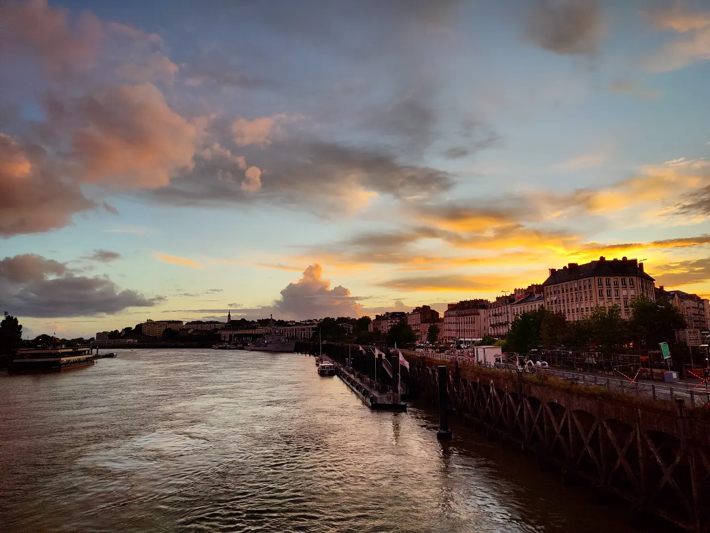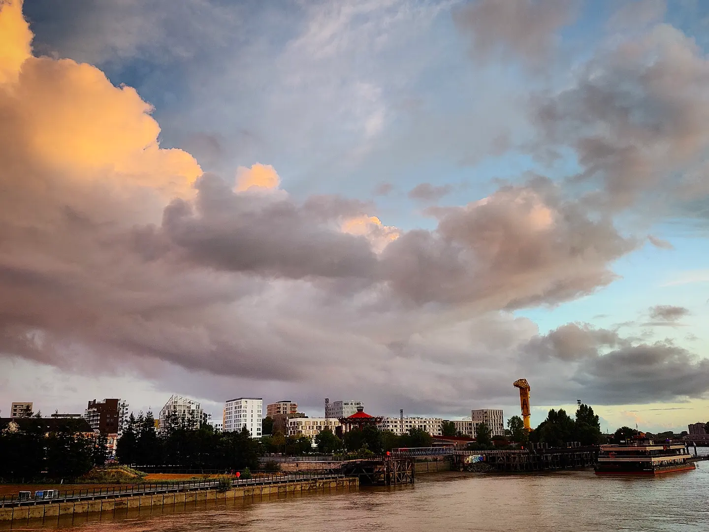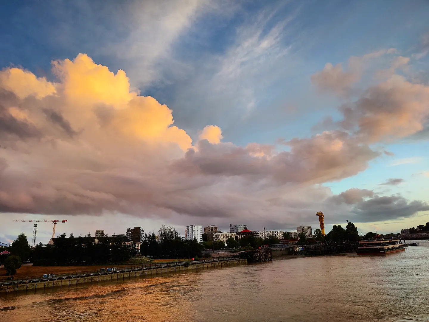Bah oui, y’a pas à dire un ciel n’est jamais aussi beau que quand il est constellé de chouettes nuages bien fluffy, mafflus et joufflus1. Et hier soir, sur le pont Anne de Bretagne, le spectacle au coucher du soleil était magnifique. De tous les côtés, on y voyait un ciel digne d’un de ces paysages de Delft des primitifs flamands.