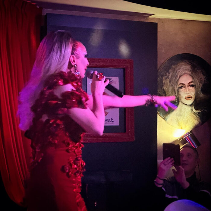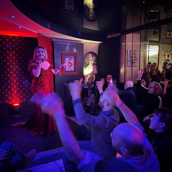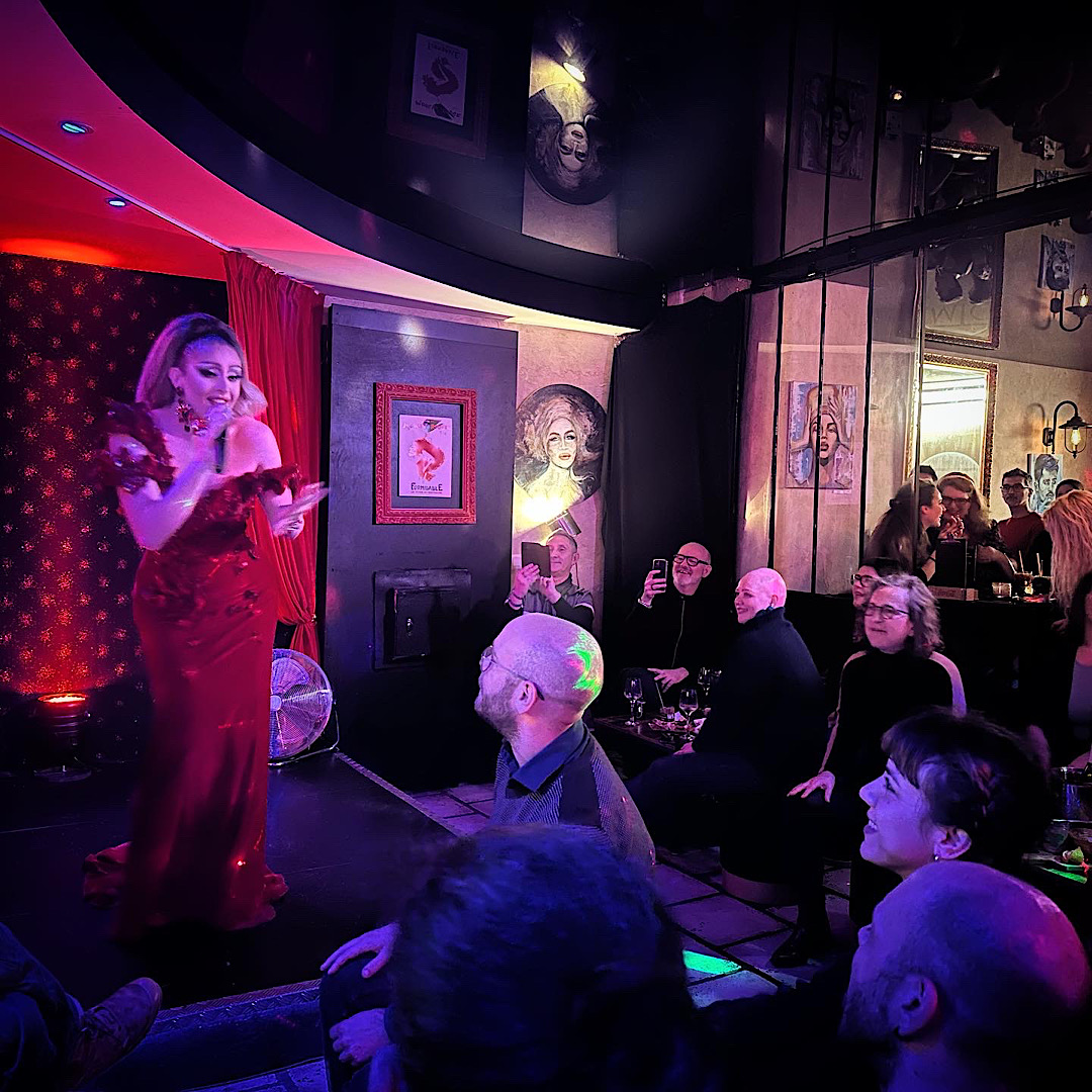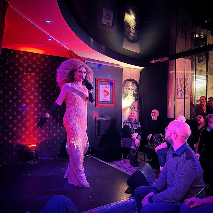 On n’a pas regretté, et encore une fois on s’est peut-être fait avoir par un charme feint, mais force est de constater qu’elle est vraiment charmante et sympathique dans toutes ses attitudes, et n’a jamais joué les grandes dames. Elle a animé la soirée en reprenant des standards français et anglophones, passés et actuels, et en démontrant ses capacités vocales vraiment pas anodines, en plus d’une justesse impeccable. C’était un vrai « show drag » et qui valait aussi le coup car ce n’était pas seulement du lipsync mais une vraie chanteuse. Cela a donné une chouette ambiance cabaret très très bon enfant avec un public aussi adorable qu’elle.