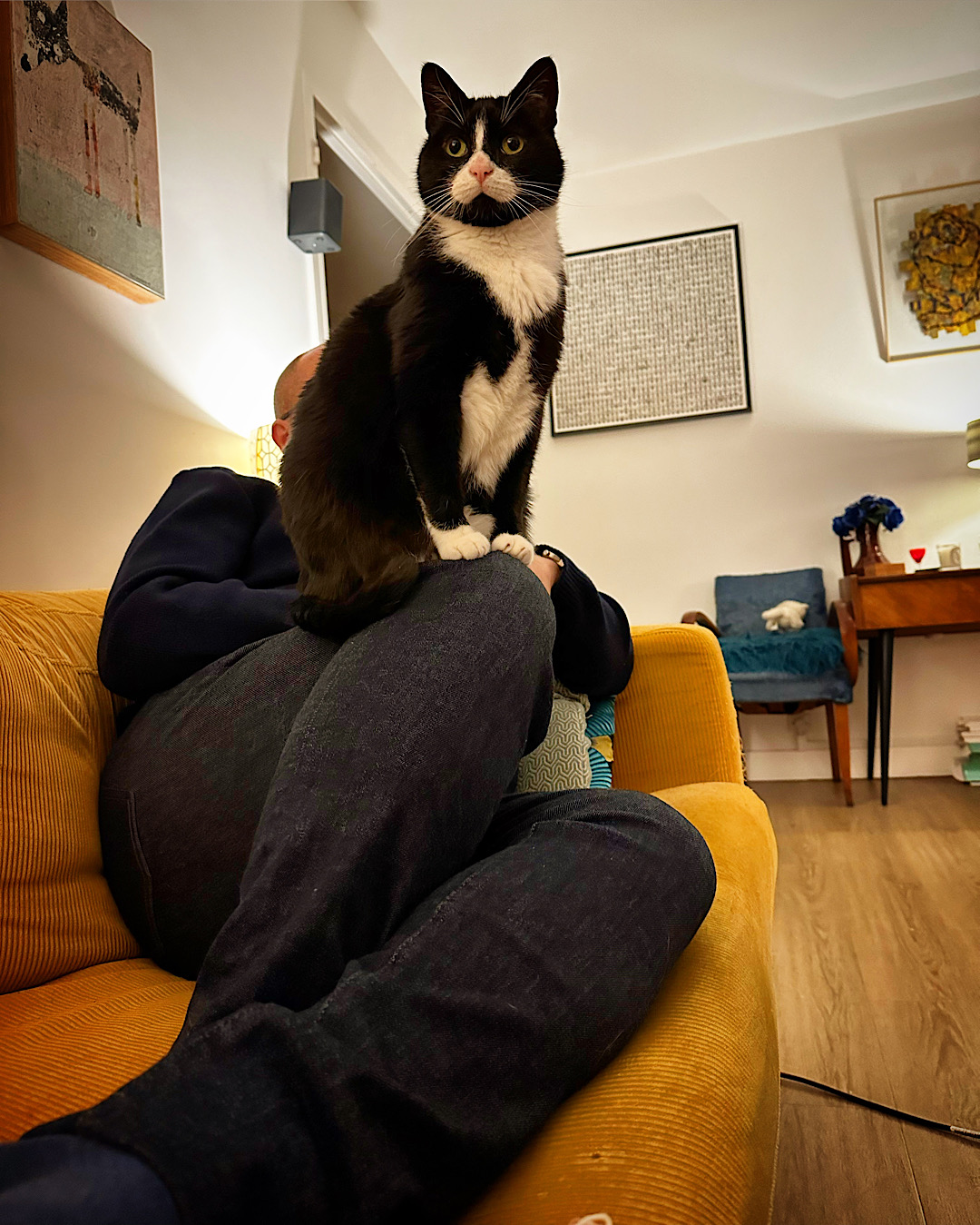 Elle m’a grimpé dessus à la cool, et elle était très bien installée. 5kg sur le genou comme cela, c’est lourd et assez inconfortable, je vous assure !!