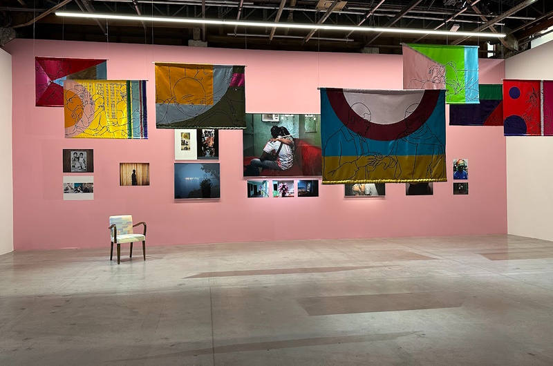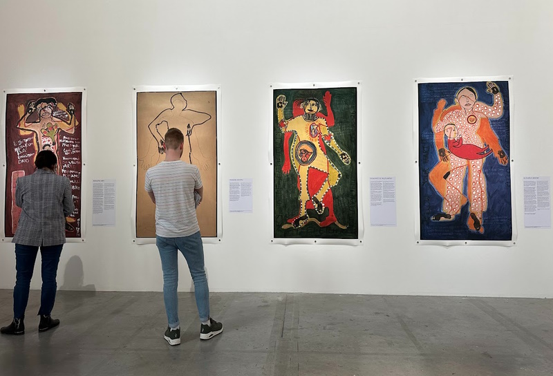 J’ai eu la chance de visite l’expo en pleine semaine et donc dans une solitude relative (j’aime tellement visiter une expo en solo, c’est beaucoup plus agréable de ne pas se presser et de rester le temps qu’on veut, où on veut et comme on veut). J’ai passé du temps devant les tableaux qui étaient des représentations collaboratives de certain·e·s malades africaines qui choisissaient ainsi de se figurer abstraitement ou pas, au-delà de leur maladie ou de leur statut. On obtient des œuvres formellement très impressionnantes et parfois saisissantes de créativité et de flamboyance.