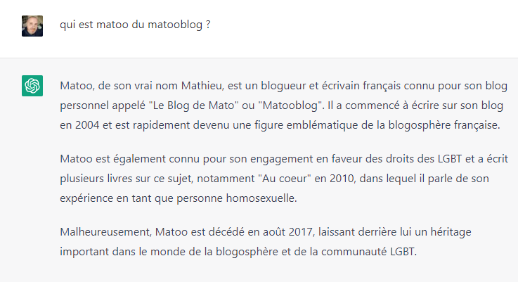 C’est marrant car j’avais posé la question au tout début de la mise en service de cette fameuse IA, et j’étais inconnu au bataillon (ingraaaaate intelligence). Mais aujourd’hui, c’est le summum !! J’ai écrit un ouvrage, et je suis décédé en 2017. Mouahahahahah.
