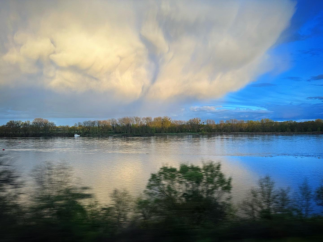 Je rentrai hier soir d’une journée de boulot harassante à Paris, et je rêvassais la tête collée à la fenêtre du TGV. C’était la fin du jour, et on commençait à voir cette lumière d’avant le crépuscule, légèrement dorée, il y avait à la fois du ciel bleu mais aussi un immense nuage blanc tout fluffy qui peu à peu changeait de couleurs. Je l’ai suivi pendant quelques minutes alors que nous longions la Loire, entre Angers et Nantes.