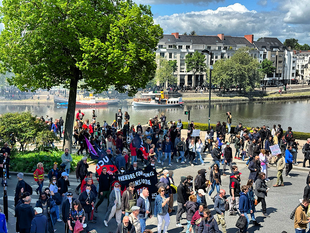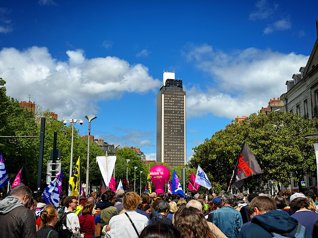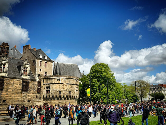 Et le cortège est allé jusqu’au château des Ducs de Bretagne, avec une atmosphère beaucoup moins sympathique. Les familles sont parties, l’air était piquant des lacrymos apportées par le vent, les groupes stagnaient avec quelques véritables casseurs (rien à voir avec les blacks blocs ou anarchistes qui en voulait à la préfecture et donc à l’Etat ou aux policiers dans cette représentation du pouvoir) qui se sont évertués à péter les abris de tram ou les distributeurs de billets. Habillés pareils mais ce ne sont pas les mêmes personnes, c’était vraiment très clair quand ils ont ôté leurs masques. C’était des types complètement défoncés, les yeux injectés de sang, l’air hagard et complètement galvanisés par le déferlement de violence et les actes de vandalisme. L’un d’eux qui scandait sans discontinuer « chuis vénère, chuis vénère ». Très très triste…
