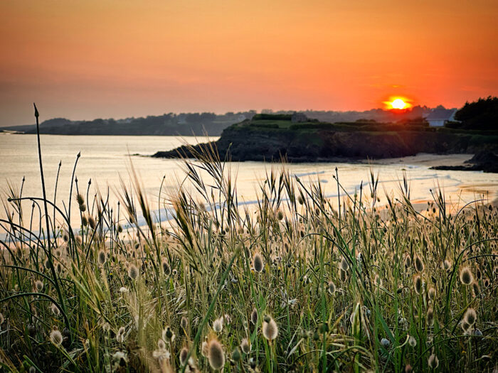 Alors que l’on sent poindre l’été, le soleil se couche à présent un peu trop dans les terres pour moi, alors on va plutôt côté Morbihan sur des pointes orientées le plus à l’ouest possible. L’idéal c’est vers Kerroc’h (Ploemeur) à cet endroit où on est le plus près de l’île de Groix, et où on voit tout le détail des villages et côtes d’en face. Et cette petite pointe est un bijou particulièrement photogénique.