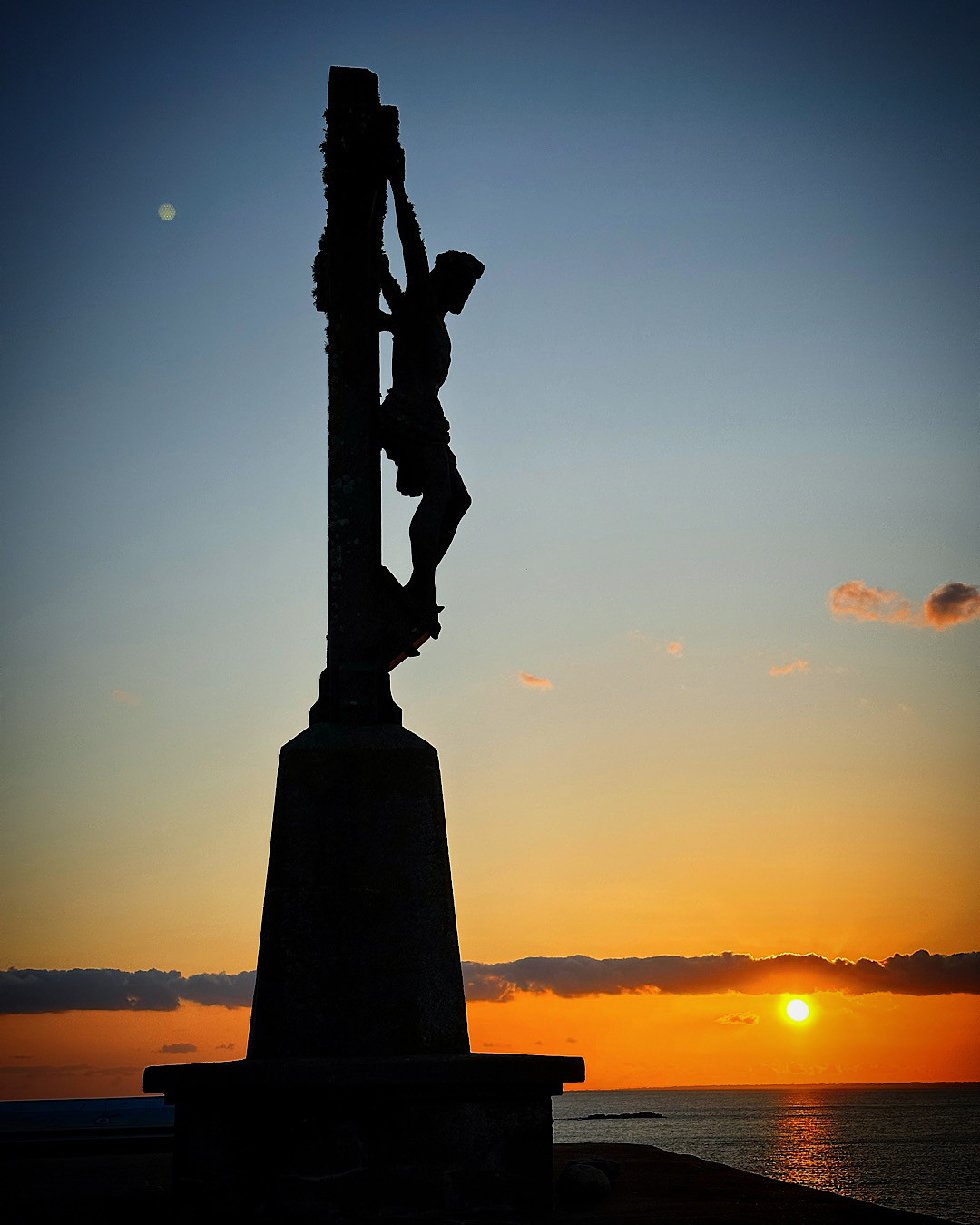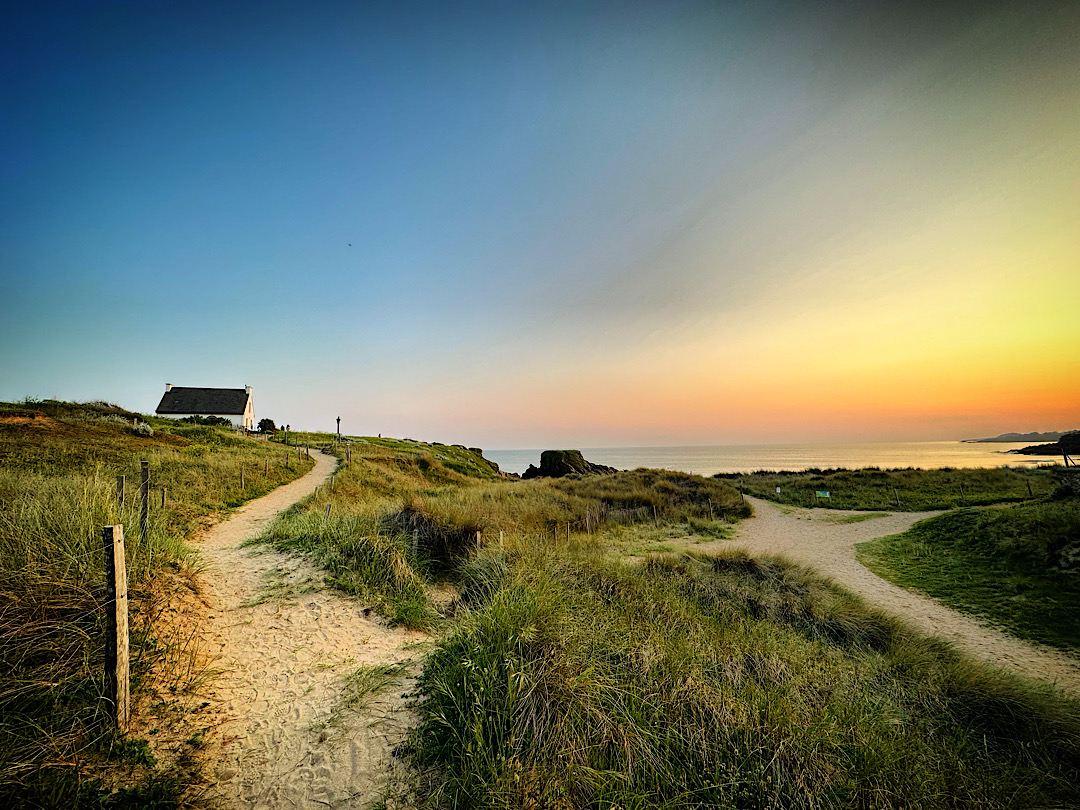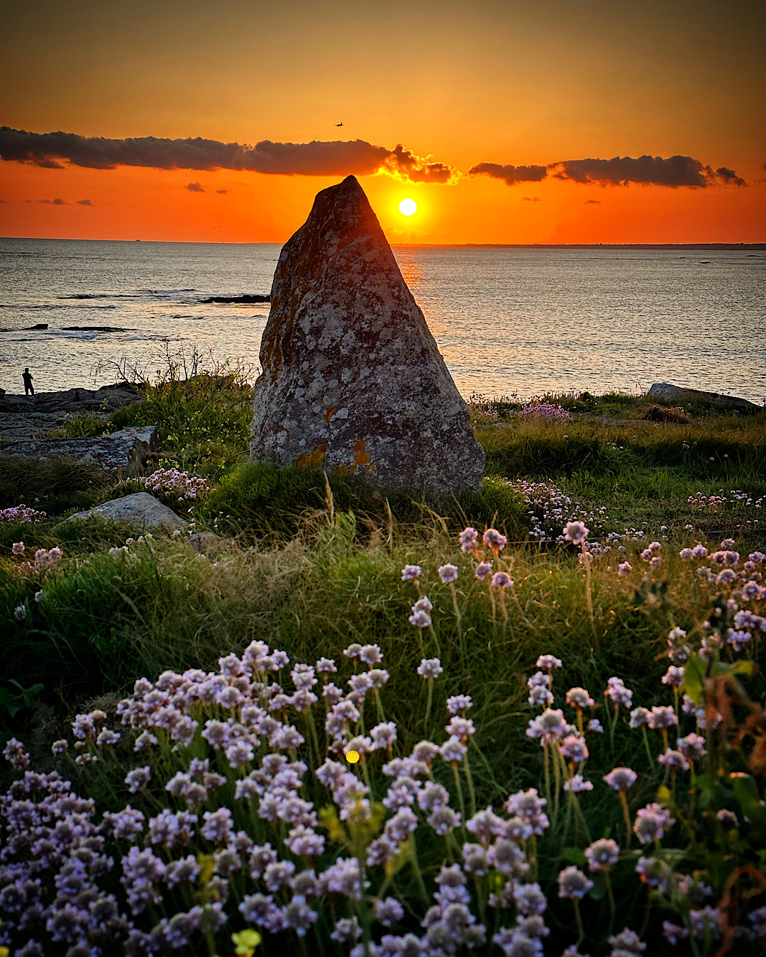 Alors que l’on sent poindre l’été, le soleil se couche à présent un peu trop dans les terres pour moi, alors on va plutôt côté Morbihan sur des pointes orientées le plus à l’ouest possible. L’idéal c’est vers Kerroc’h (Ploemeur) à cet endroit où on est le plus près de l’île de Groix, et où on voit tout le détail des villages et côtes d’en face. Et cette petite pointe est un bijou particulièrement photogénique.