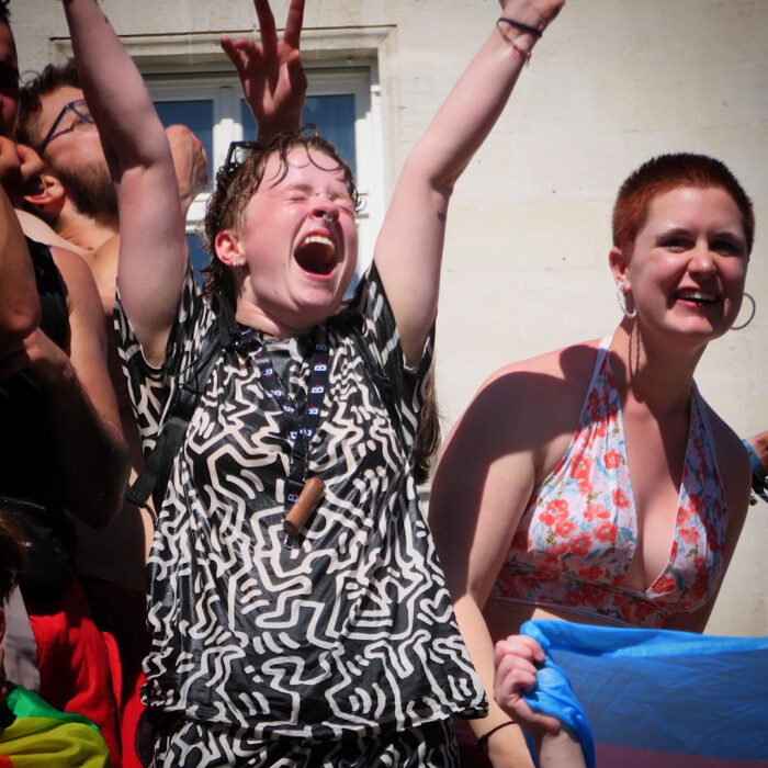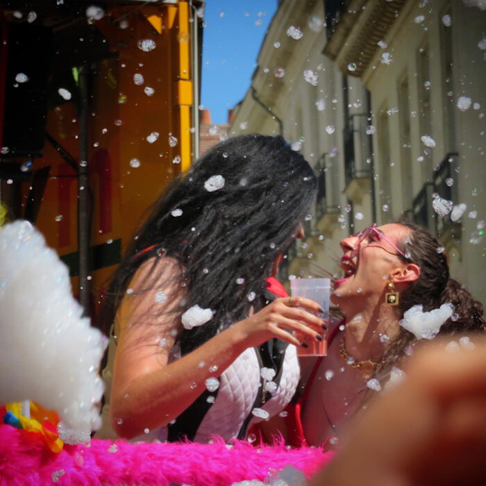 Et j’aime bien aussi parfois poser mon regard sur un détail. Par exemple, il y avait un char et j’aperçois au loin deux femmes qui saluent les passants et la marche avec un petit drapeau arc-en-ciel (qui est un sac de course réutilisé, mouahahahahahah). Je zoome, je zoome, et à un moment l’une d’elle me remarque, et elles se mettent à me saluer à mon tour. Trop d’amour je vous dis !!!