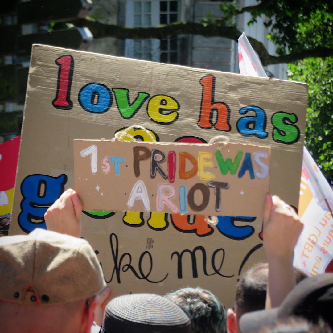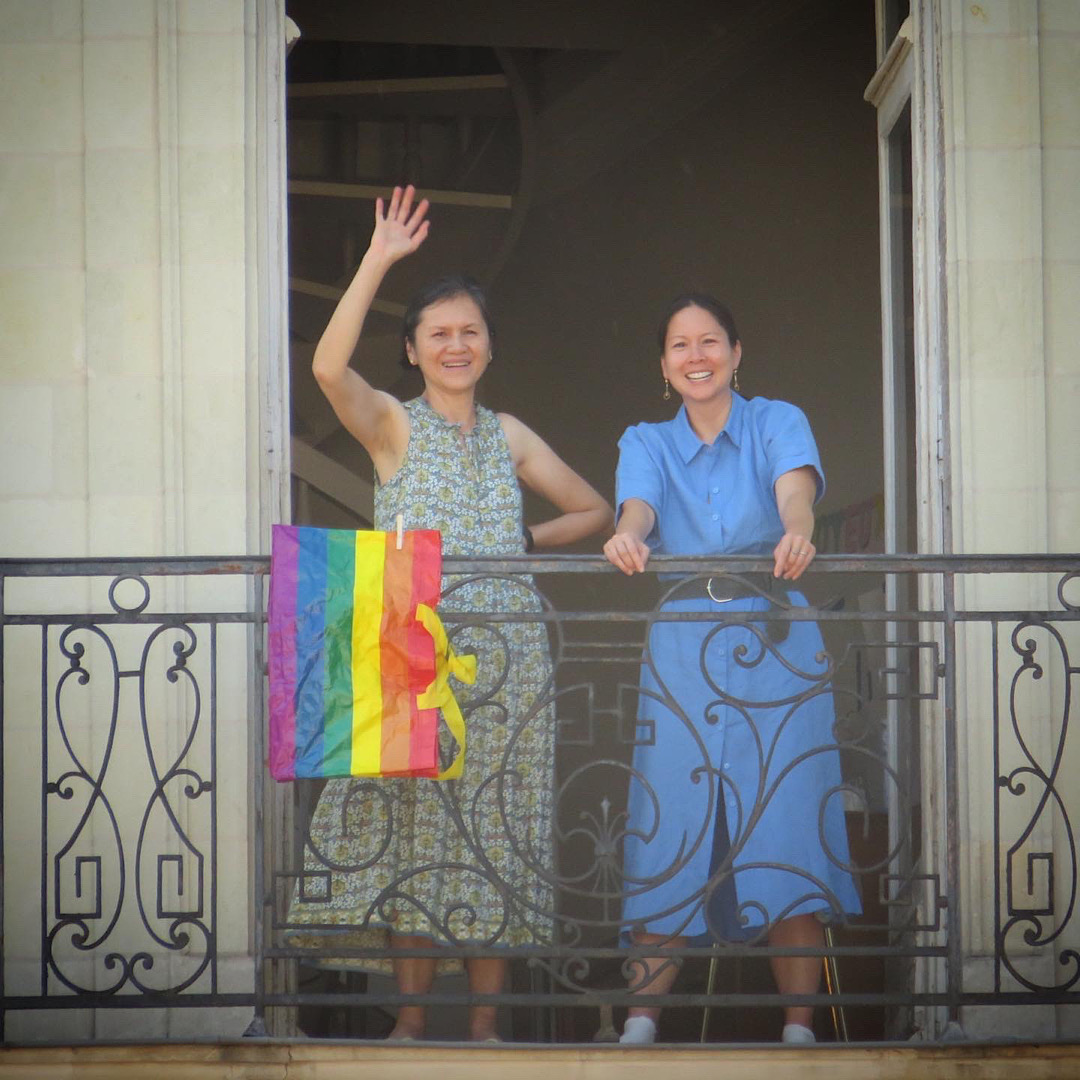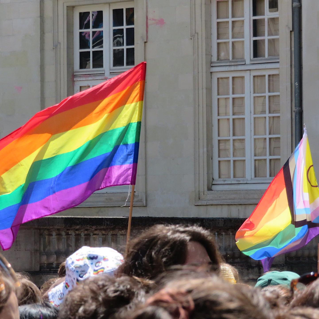 Belle journée! Je ne peux m’empêcher d’être frappé, vu d’ici, par le décalage entre les bâtiments historiques qui marquent une époque où l’on n’affichait pas publiquement la diversité sexuelle et de genre et les manifestations… Ce décor plante les choses de manière magnifique pour marquer le changement social… et aussi, la fragilité des acquis humains face à la résistance qui se fait à nouveau jour face à celui-ci.