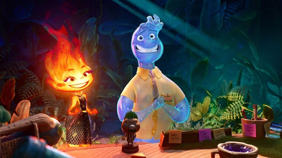 Le coup d’avoir une personnification des éléments est sympa mais je n’ai pas été épaté par les métaphores qui en découlent, c’est très très attendu et moins original (ou alors en tout cas un rien déjà-vu) par rapport aux émotions incarnées de Vice-Versa. Néanmoins, il y a une super bonne idée et elle est plutôt bien imagée dans le film c’est que les « gens en feu » sont clairement des étrangers, et ils sont dans des quartiers pauvres et en marge de la société. La famille ciblée là, celle de la gamine Ember Lumen, arrive à l’immigration dans une image d’Épinal d’Ellis Island, et à partir de patronymes trop compliqués à prononcer en anglais, on les renomme Bernie et Cinder. Je ne suis pas certain du choix d’accent mais ça me faisait penser perso à du farsi et parfois dans le film on est avec des accents un peu indiens ou pakistanais. Tout cela est très cliché, surtout quand on rajoute une société adaptée sur mesure aux peuples aqueux, qui sont clairement les « white cis bourgeois » (les gens en feu manquent de se faire éteindre à chaque coin de rue avec de la flotte juste partout dans la ville), et avec une position très inexistante des terreux (vraiment des figurants un peu benêts), et des venteux (du personnel administratif tout au plus ^^ ).