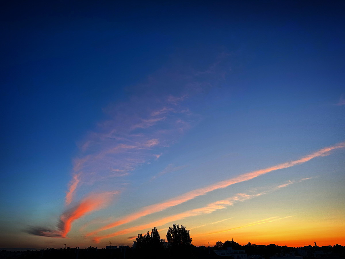 C’était étrange cette journée aussi chaude, alors que les derniers jours étaient plutôt agréables. Mais comme d’habitude, cela donne de beaux couchers de soleil avec un ciel assez pur et azuréen, et juste quelques nuages effilochés et rendus éclatant par l’orangé du couchant.