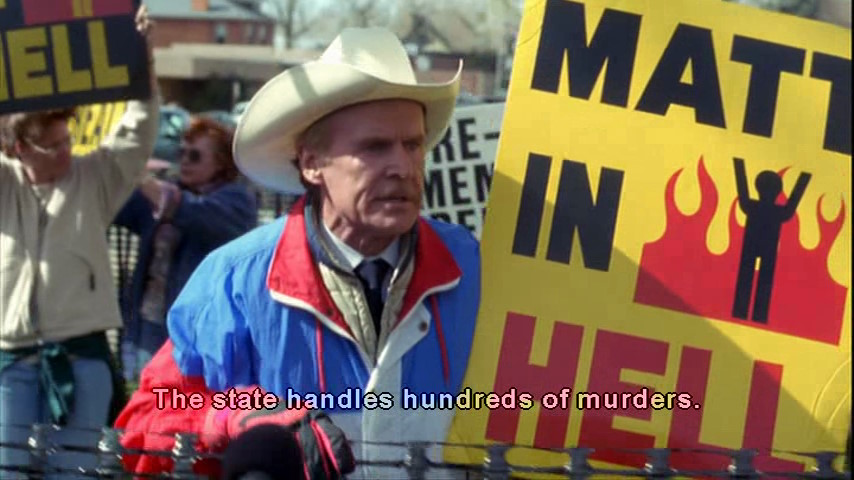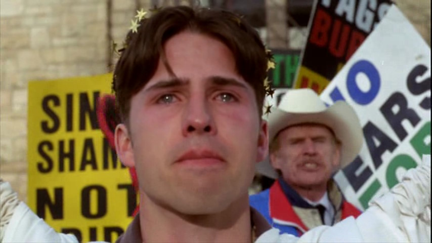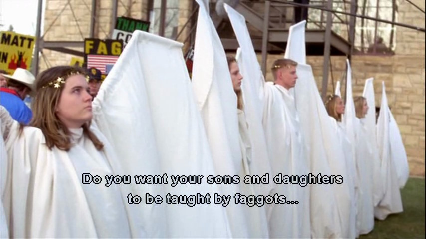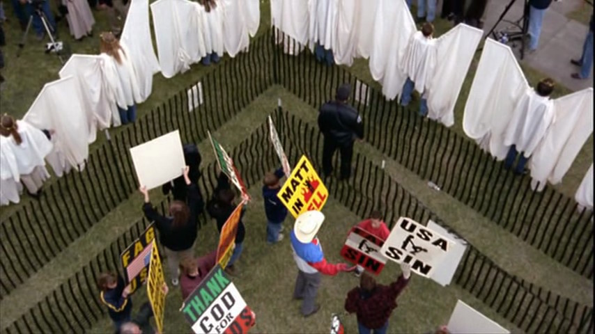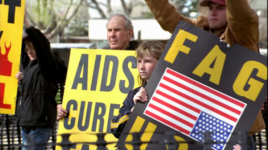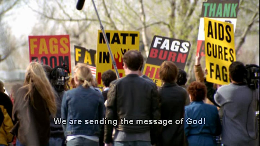 Pendant que Matthew est à l’hôpital et durant le procès de ses assassins, le révérend Phelps, tristement célèbre, est là avec ses zélotes. Il est là à crier et ahaner que le SIDA guérit de l’homosexualité et que god hates fags. C’était insupportable je pense de voir ces vociférations (légales) devant le tribunal et tous les journalistes qui s’entassaient là.