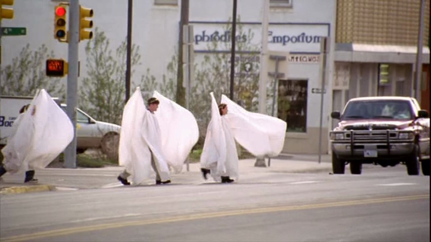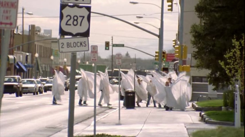 L’amie de Matthew a alors l’idée de découper de grandes toges blanches avec des ailes immenses d’anges, pour dissimuler complètement les homophobes. La scène est d’une puissance redoutable dans le film.