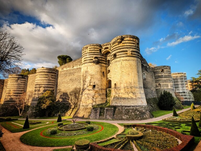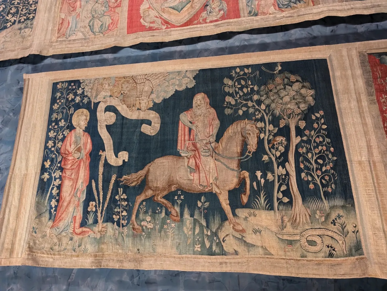 Comme pour le musée de la tapisserie de Bayeux, la tenture, qui est un peu plus récente puisqu’elle date de 1375-1377, est exposée dans une salle en entier et avec une très basse lumière pour des raisons de conservation. Elle a été très abîmée à un moment où passée de mode, elle a carrément été utilisée en morceaux comme tapis ou comme couverture pour des chevaux. Hu hu hu. Mais cette merveille a heureusement été restaurée et est plutôt bien exposée (même si je trouve que la muséographie est vraiment au minimum alors que le potentiel de ce truc est illimité selon moi). Là où Bayeux est incroyable car c’est 300 ans avant et on est dans une œuvre beaucoup moins élaborée et « belle » mais un récit incroyable témoignant d’épisodes historiques, on est là dans une illustration grandeur nature et magistrale d’un texte religieux célèbre et emblématique : l’Apocalypse de Saint-Jean. Et cette tenture raconte tout cela comme dans une bédé à grand renfort de représentations formelles et de métaphores plus ou moins imagées.