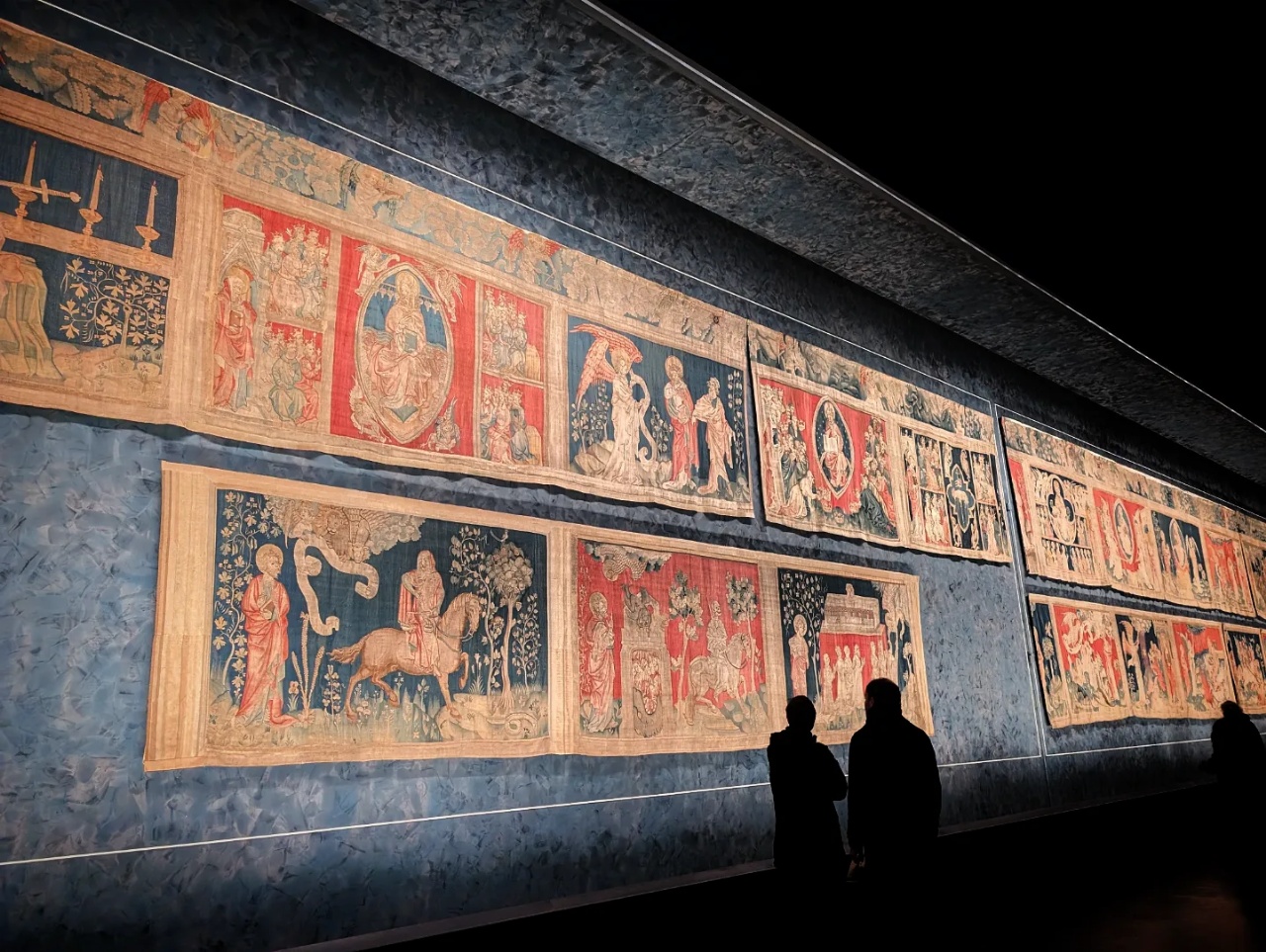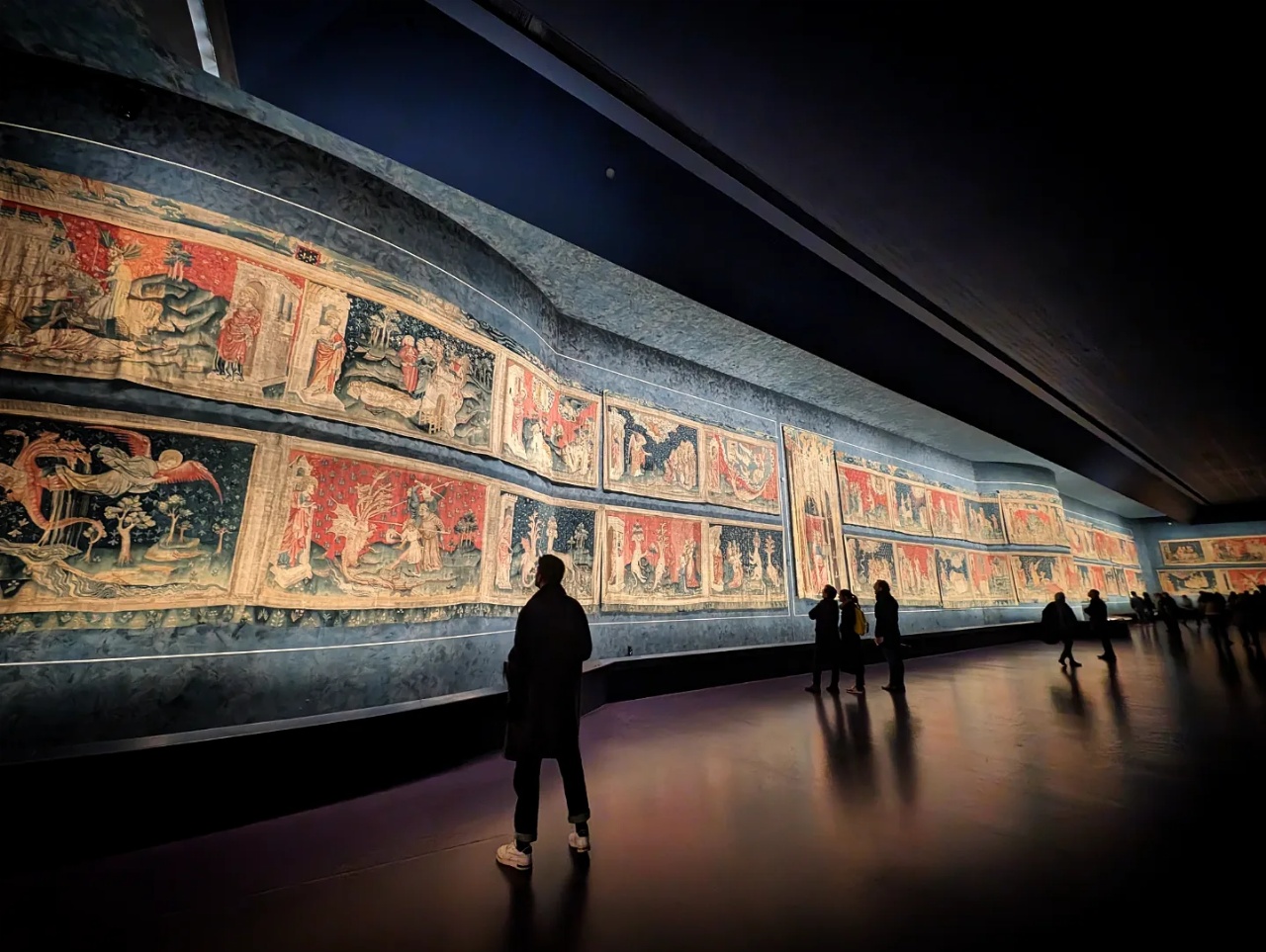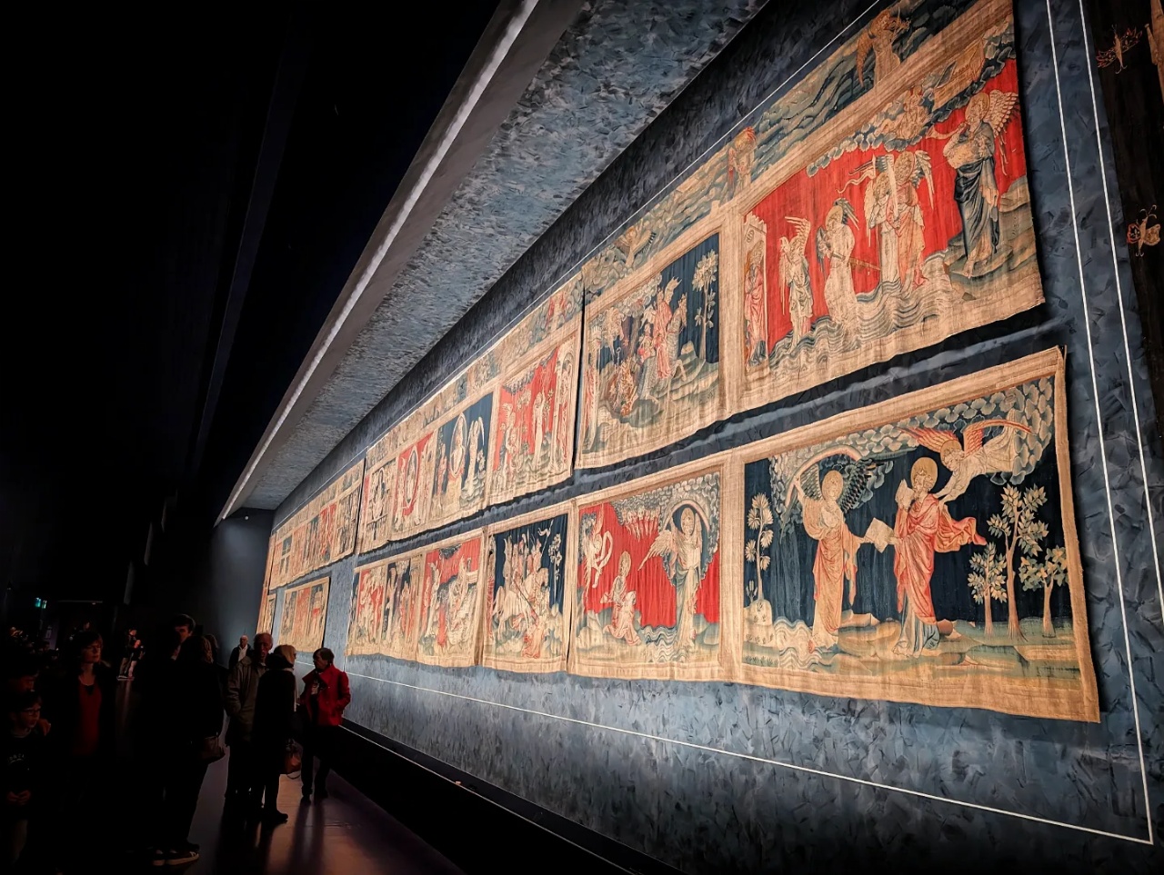 La tenture est gigantesque avec à l’origine 4,5 mètres de haut sur 100 mètres de long. Quelques morceaux sont perdus, mais vraiment on a presque tout, et on peut super facilement suivre le texte de Saint-Jean en même temps qu’on chemine le long de la tapisserie. La salle est assez grande pour ne pas se gêner, et tout est remis dans l’ordre, avec un récit en 6 saisons et différents épisodes. Ce qu’on a fait c’est qu’on a ouvert la page wikipédia qui permet de se repérer et surtout qui liste les versets à lire en même temps qu’on regarde les images.