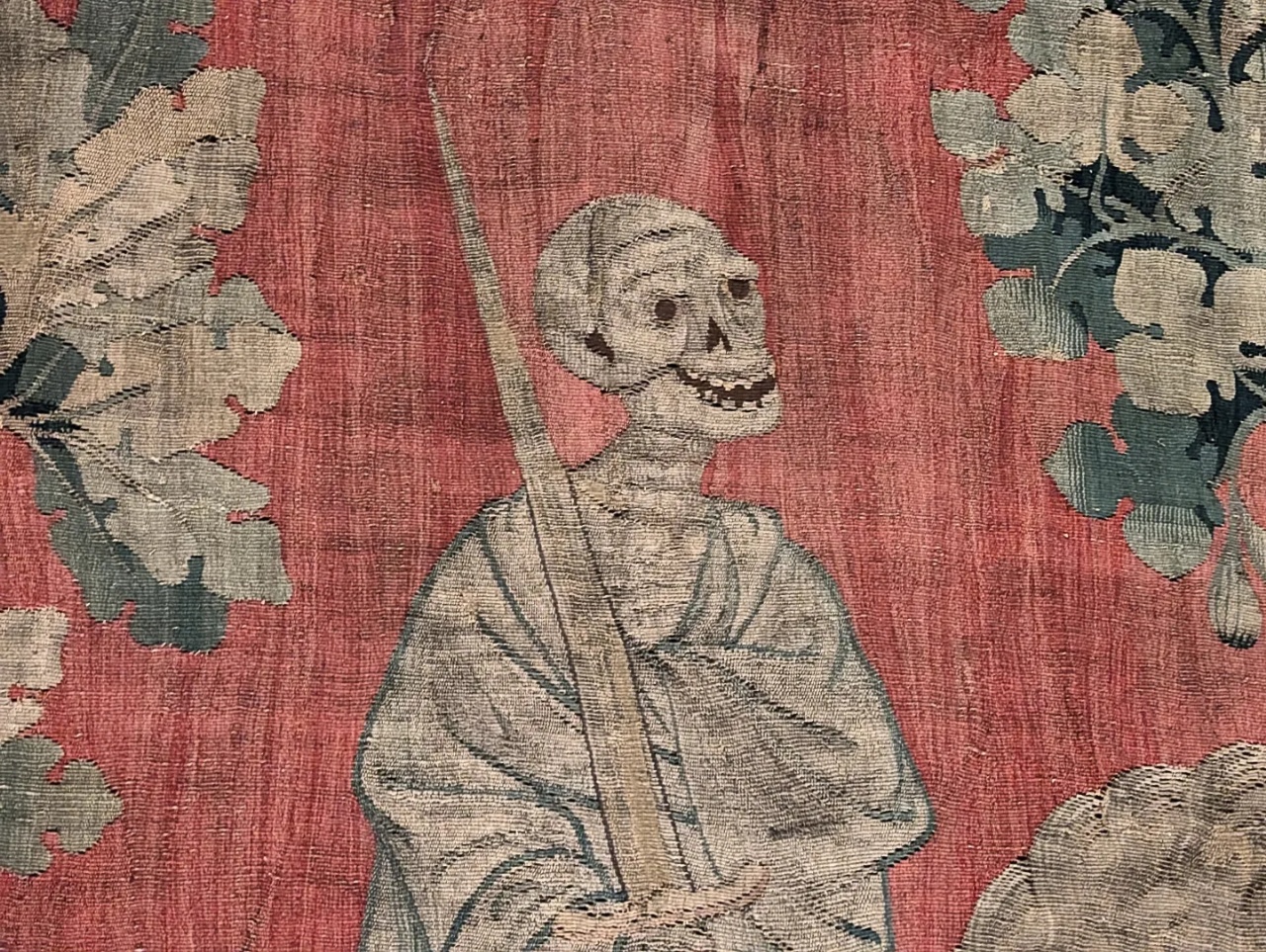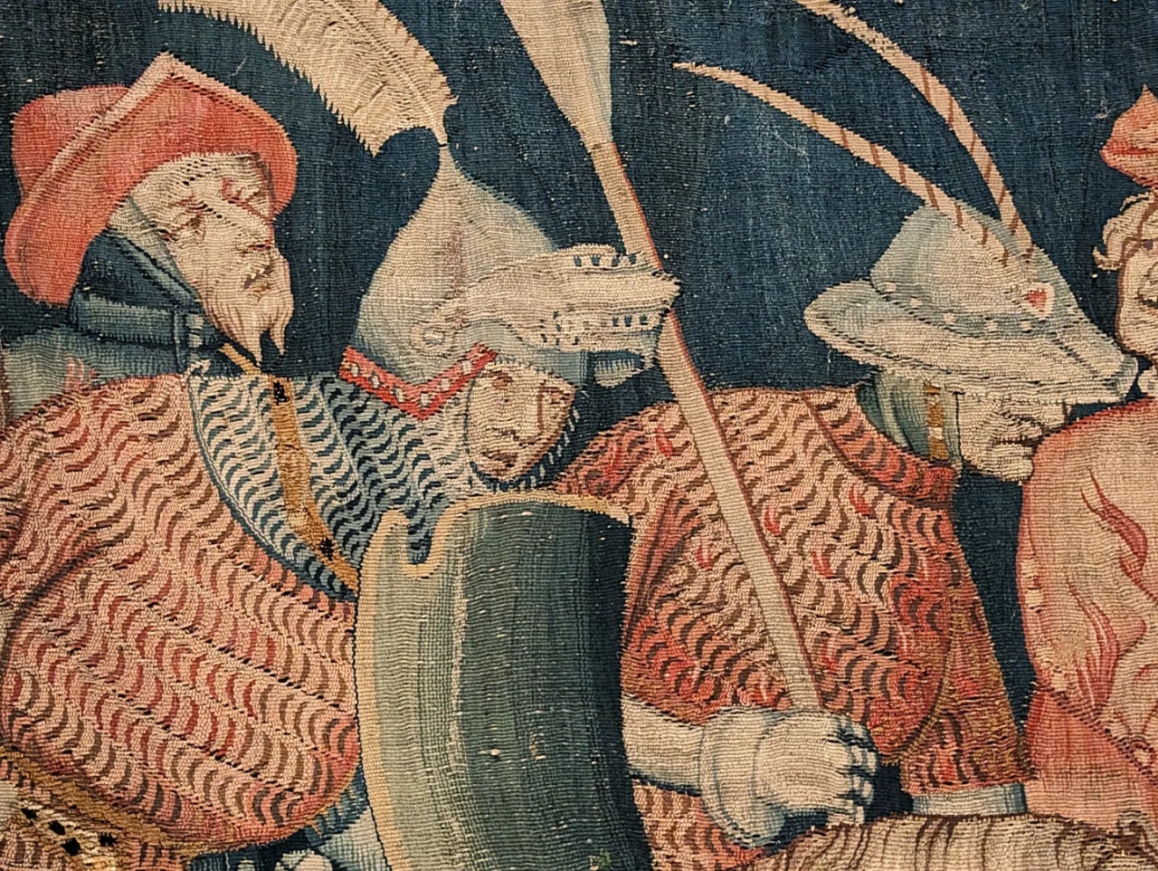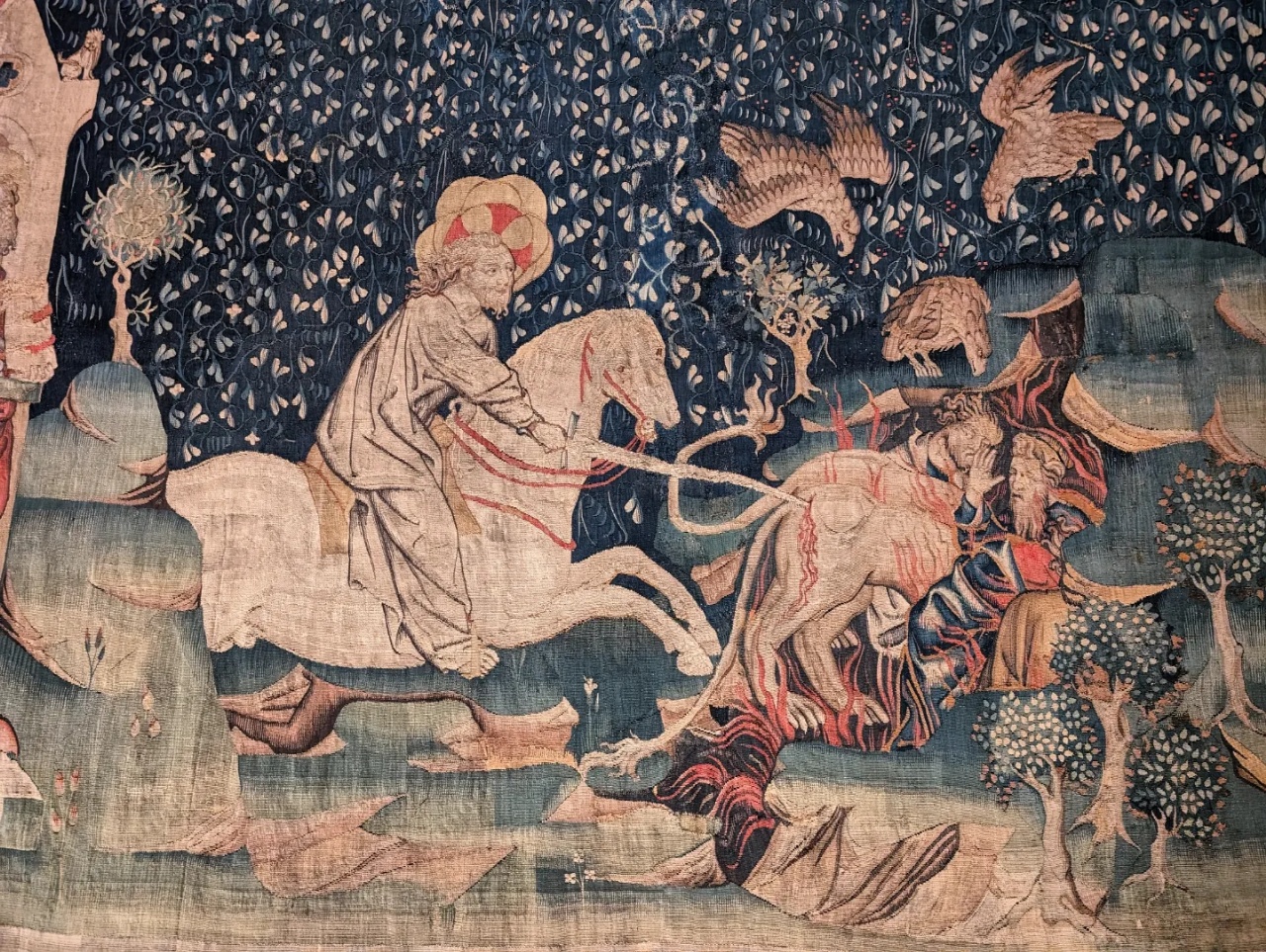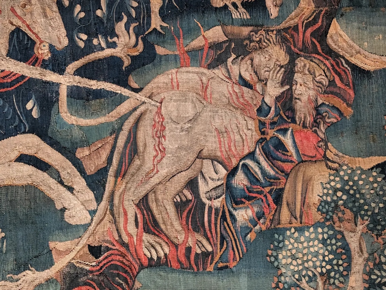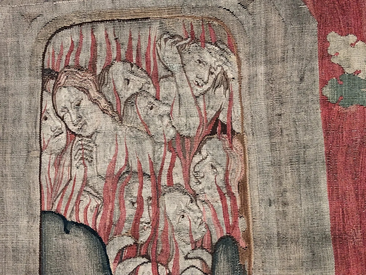 Certaines tapisseries sont vraiment flippantes et dignes de films d’horreur, et c’est vraiment cool de voir ce genre de représentations aussi anciennes, et auxquelles on n’est pas trop habitué (même si les imageries d’enfers dantesques ou les danses macabres ne sont pas joyeuses). Mais là il y a une qualité des cartons et des tissages qui vraiment fournissent un matériel captivant et très « vivace ». Quand on poursuit en plus la lecture du texte de manière synchrone, on est vraiment pris dans ce conte d’épouvante, et on peut comprendre l’impact que cela pouvait avoir sur les gens à l’époque.