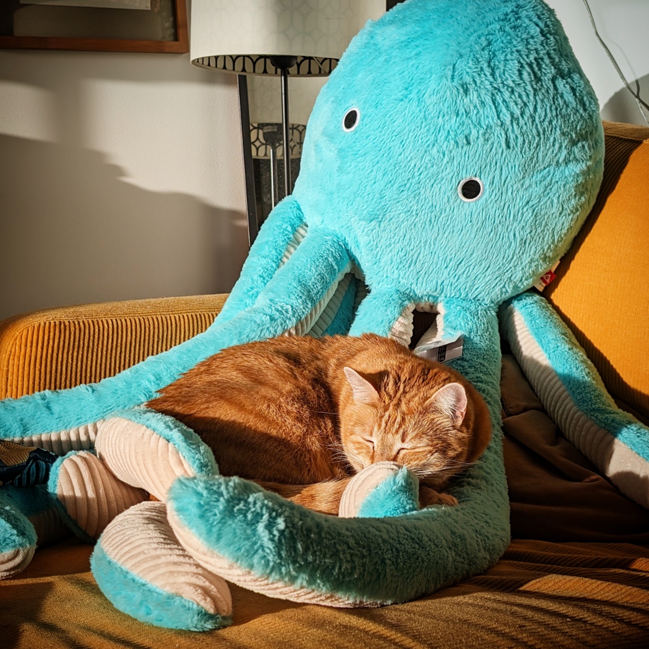Bon sinon, un week-end se termine évidemment avec des photos d’Arya et Sookie qui font les chatounettes. Donc voilà Arya qui se love dans les tentacules de notre pieuvre de canapé.