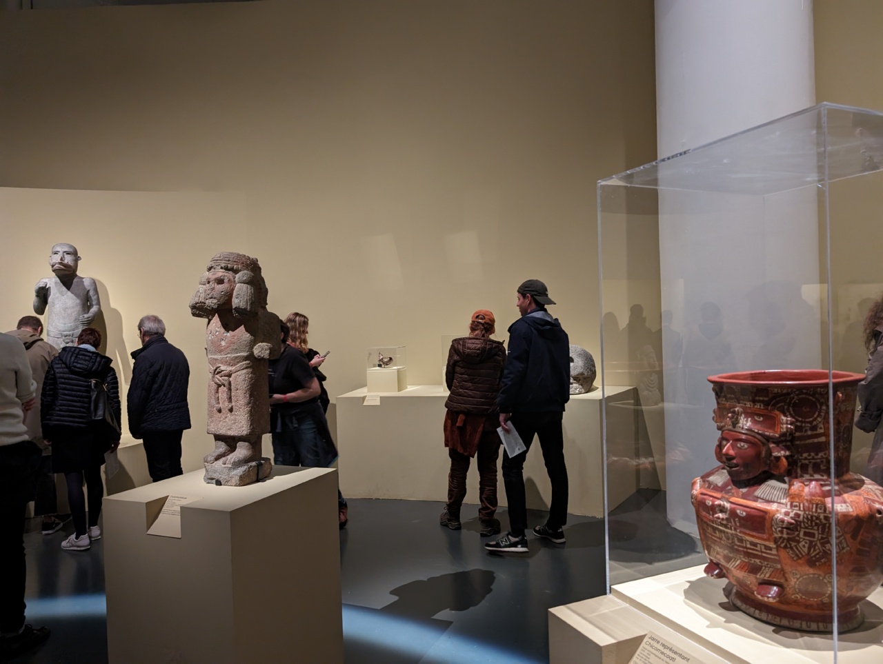 On va retrouver ces associations avec des tas de divinités plus spécialisées dans toute l’expo, et des tas d’explications sur la cosmogonie des mexicas très très intéressante (notamment la légendes des cinq soleils un peu de ouf !!). Les salles sont vastes et avec des petits stands où mieux voir les pièces avec un cheminement logique assez évident, mais la possibilité de faire aussi les choses à rebours, ou de se concentrer sur tel ou tel sous-espace. J’ai adoré le fait que les murs soient aux couleurs majeures des dieux, donc jaune pour Huitzilopochtli et bleu pour Tlaloc, ou rouge pour évoquer les sacrifices et le lien très fort avec le sang qui coule.