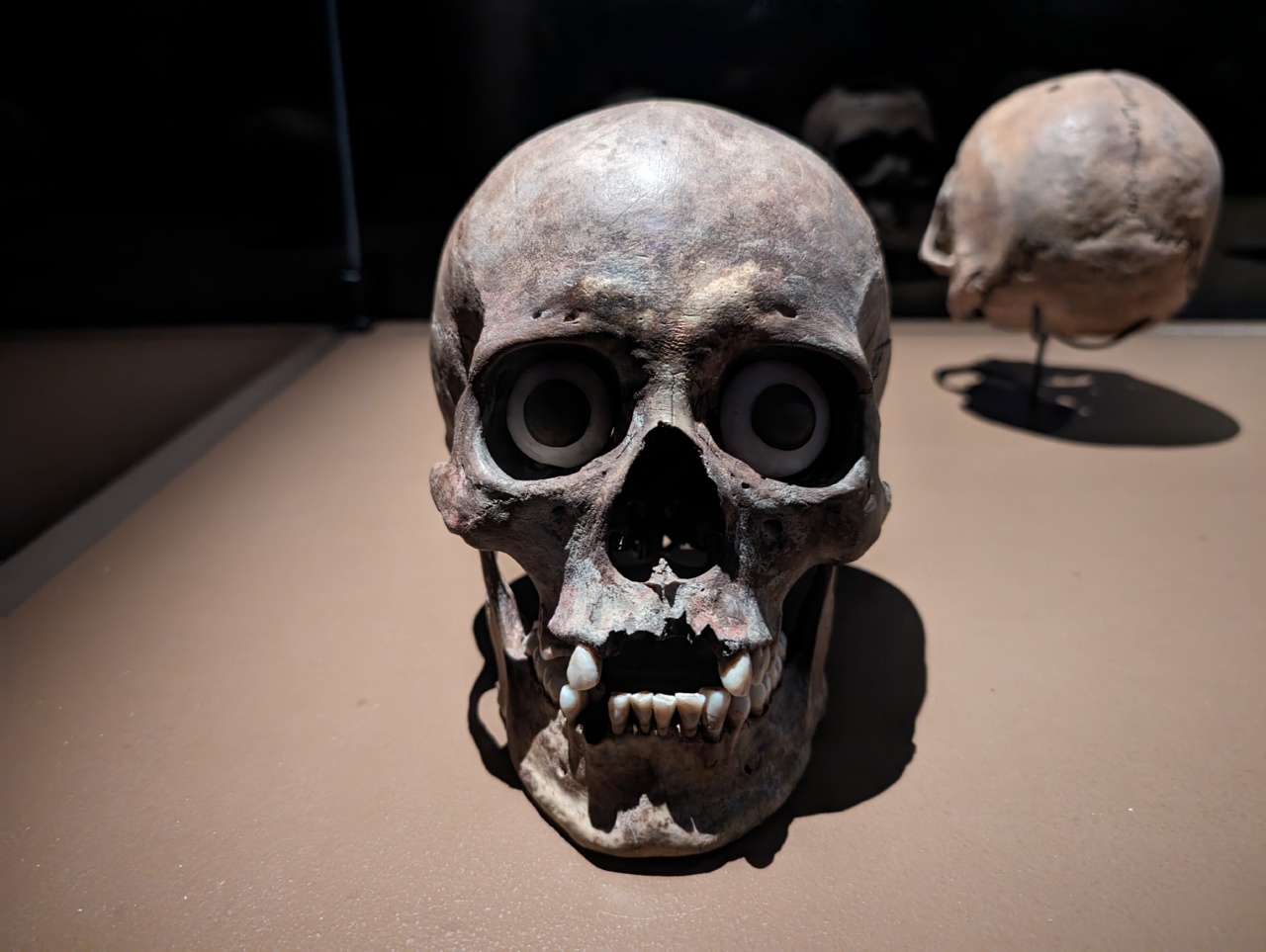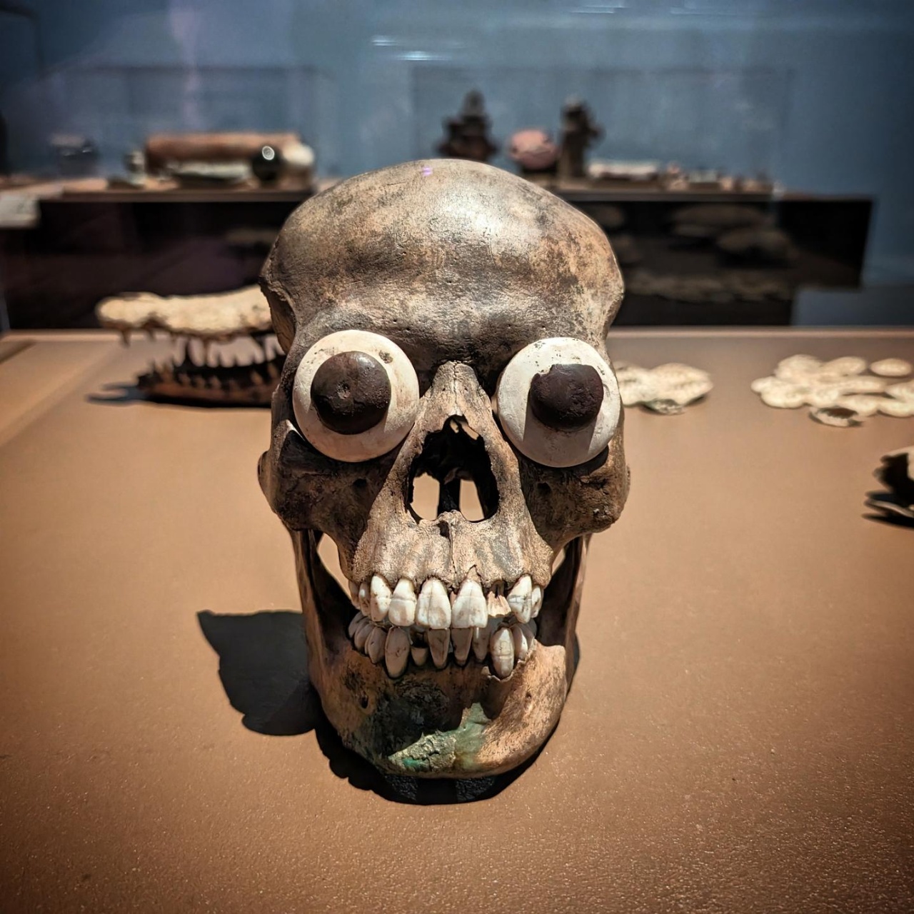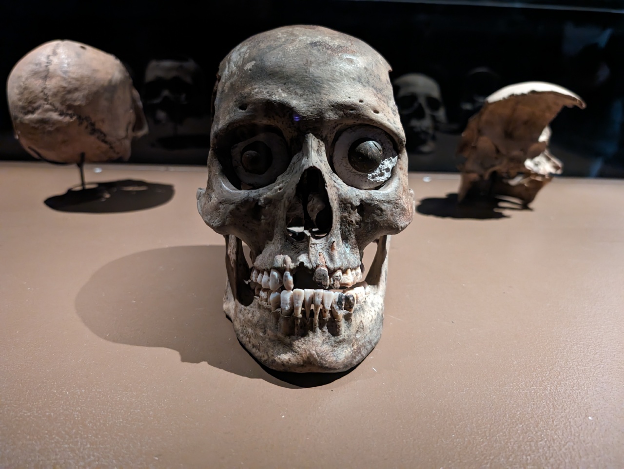Et enfin, les crânes plus ou moins apprêtés et décorés, avec l’un deux qui a conservé une lame en silex ou obsidienne planté en plein milieu.