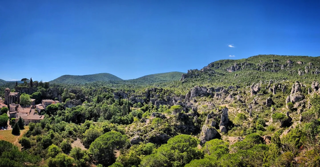 On a une vue extraordinaire du petit village de Mourèze qui est également perché sur un éperon au bord du cirque, et les vues panoramiques du coin sont somptueuses. Pour y retourner presque 15 ans plus tard, l’effet est toujours aussi fou.