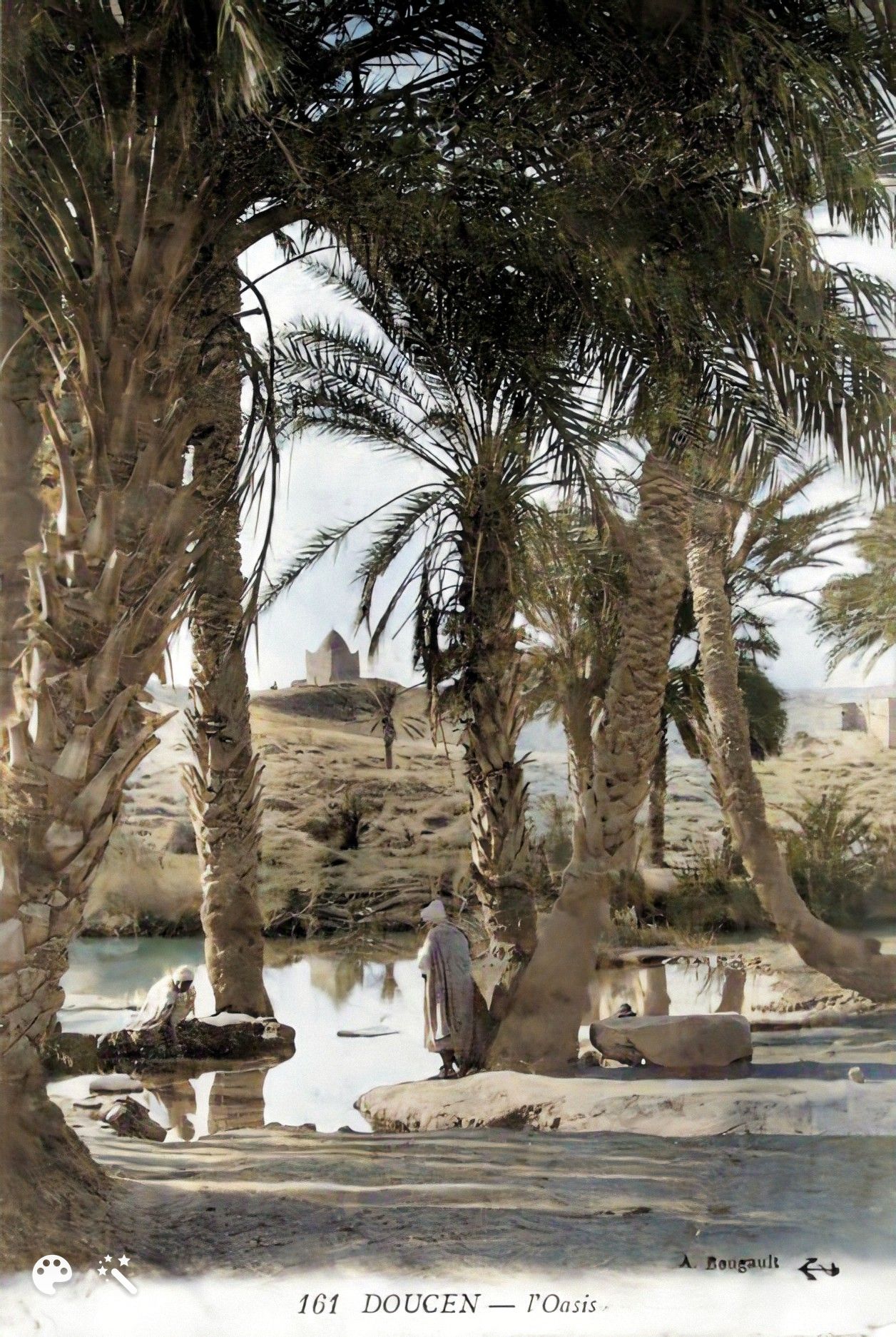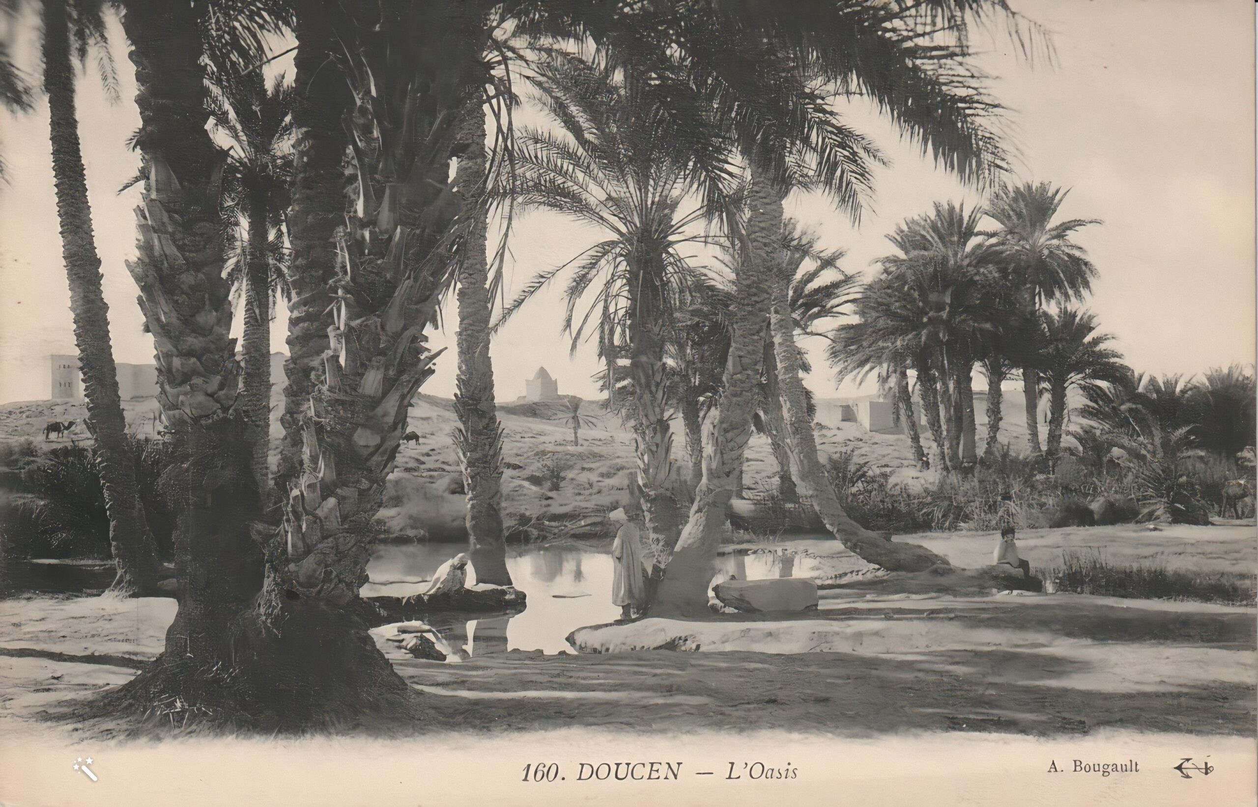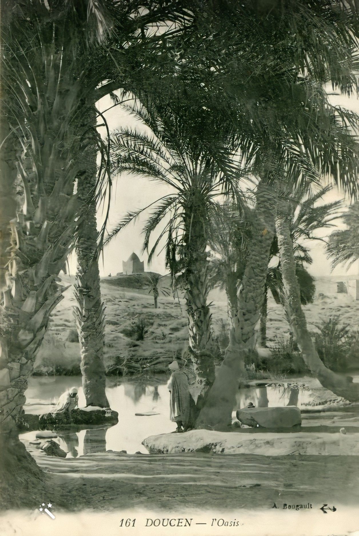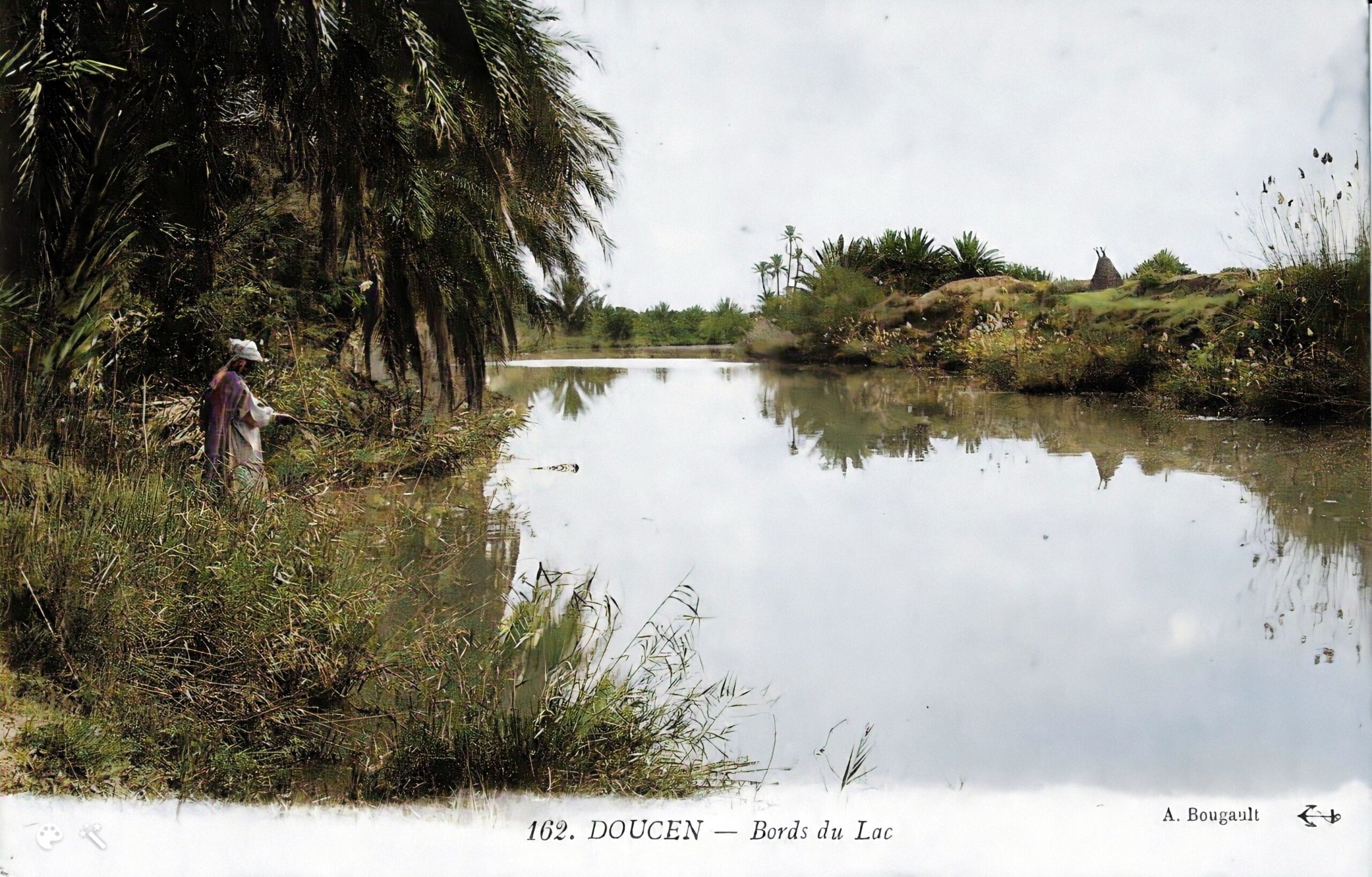 L’autre carte postale est aussi assez originale, avec la mention et la photo d’un « lac » à Doucen. L’endroit étant une oasis au cœur (aux portes ou juste derrière plutôt) du désert du Sahara, il s’agit plutôt sans doute (enfin sauf erreur de ma part évidemment, car je ne peux chercher que des infos en ligne) d’une période de pluies exceptionnelles et de débordement de l’Oued Tamda, qui provoque même des inondations de temps en temps1.