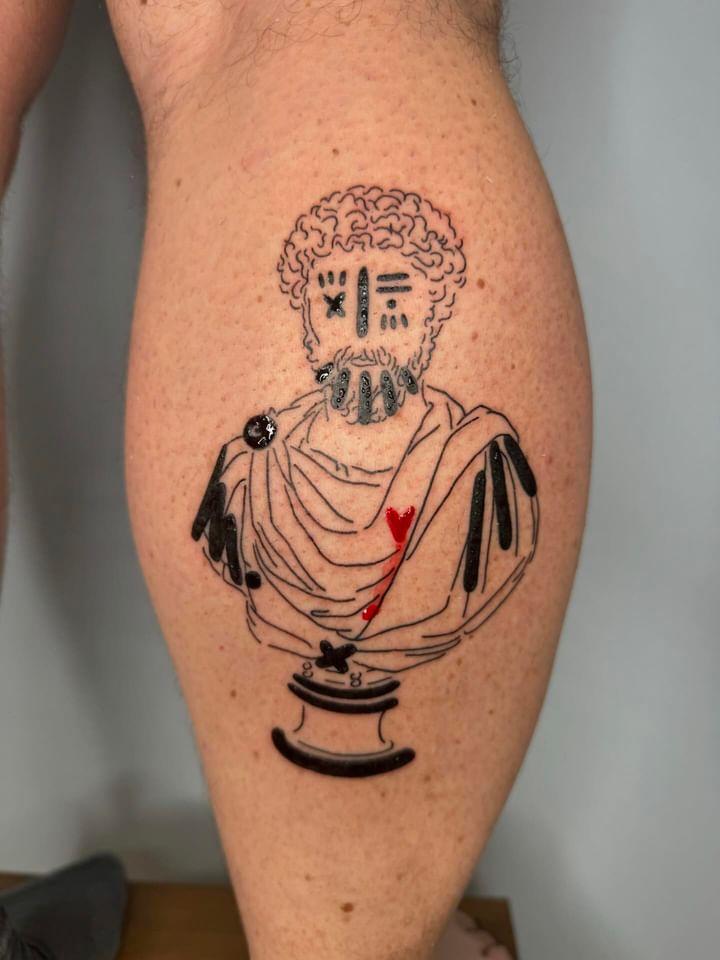 Cette fois, c’est un autre thème mais beaucoup plus évident à ceux qui me lisent ici depuis longtemps. Eh oui, l’empereur romain Marc-Aurèle a tout de même droit à une catégorie pour lui dans le blog !! Et donc basé sur une célèbre sculpture de l’empereur-philosophe du Louvre, j’ai mon tatouage à la façon de ce tatoueur dont j’aime tant le style et la patte.