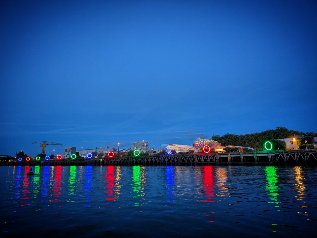En rentrant en navibus, il y avait cette jolie lumière à l’heure bleue, et le reflet des Anneaux des Buren et Bouchain sur la Loire…