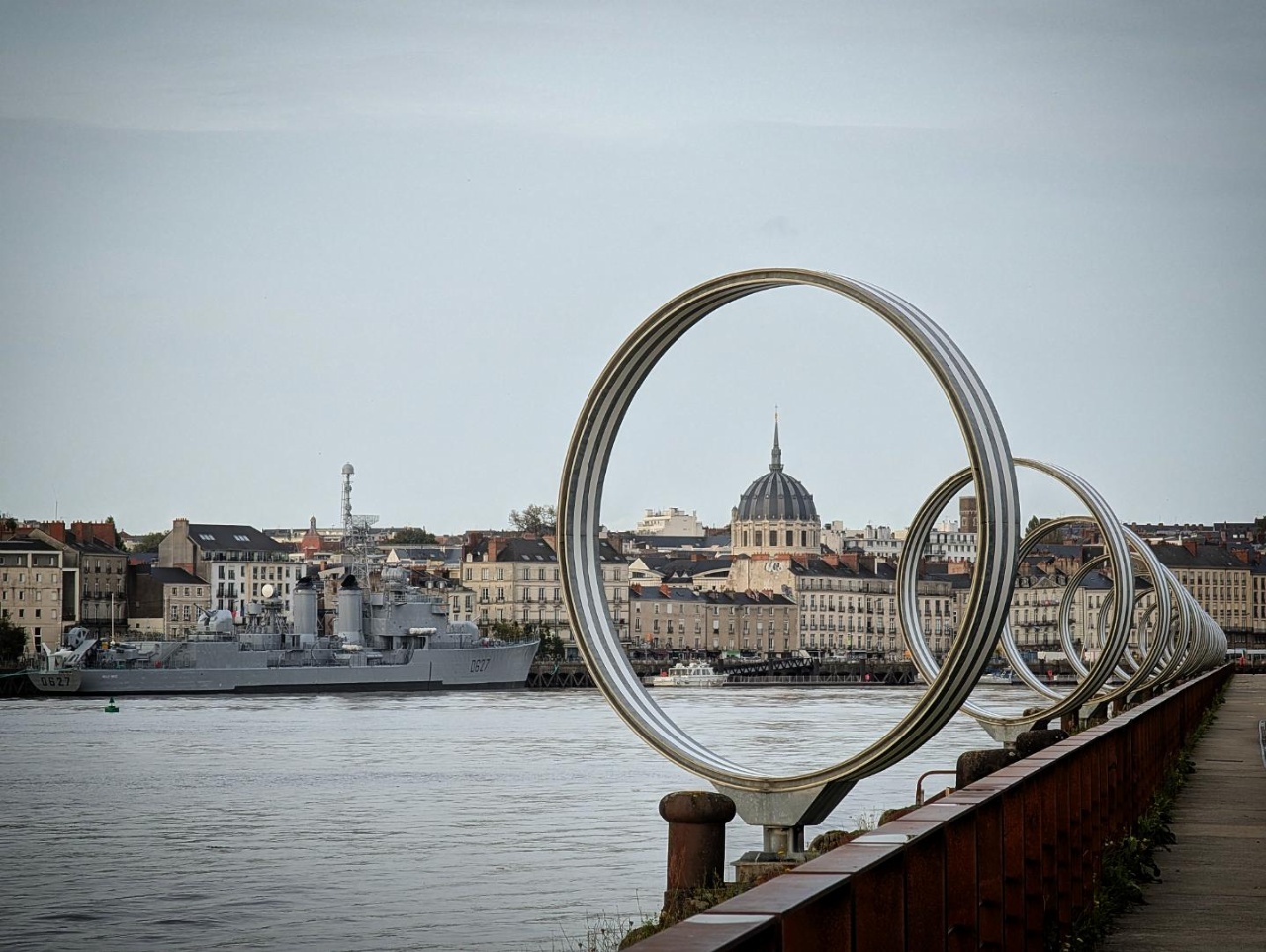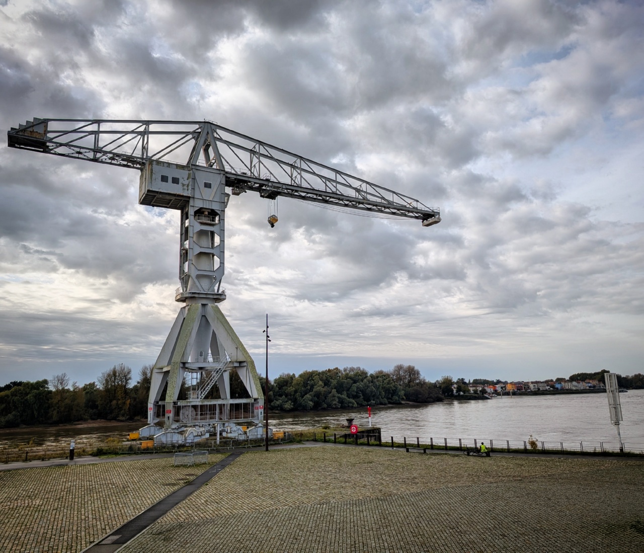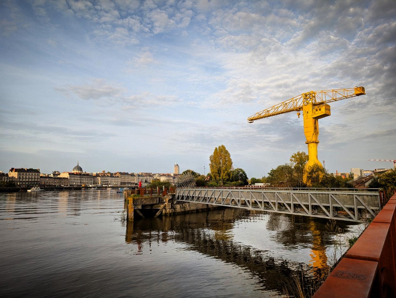 Aujourd’hui, j’étais en réunion juste à côté de la maison, sur l’Île de Nantes, et c’était vachement agréable. J’aime beaucoup cet endroit avec le Parc des Chantiers et ses deux grues monumentales, les anneaux de Bouchain et Buren, ou bien la vue sur le quai de la Fosse (où un joli trois-mâts barque de 1948 qui s’appelle le Français de Saint Malo) et Notre-Dame-de-bon-Port. J’en ai profité pour faire quelques photos en y allant ce matin, et en rentrant en flânant gentiment jusqu’à mes pénates.