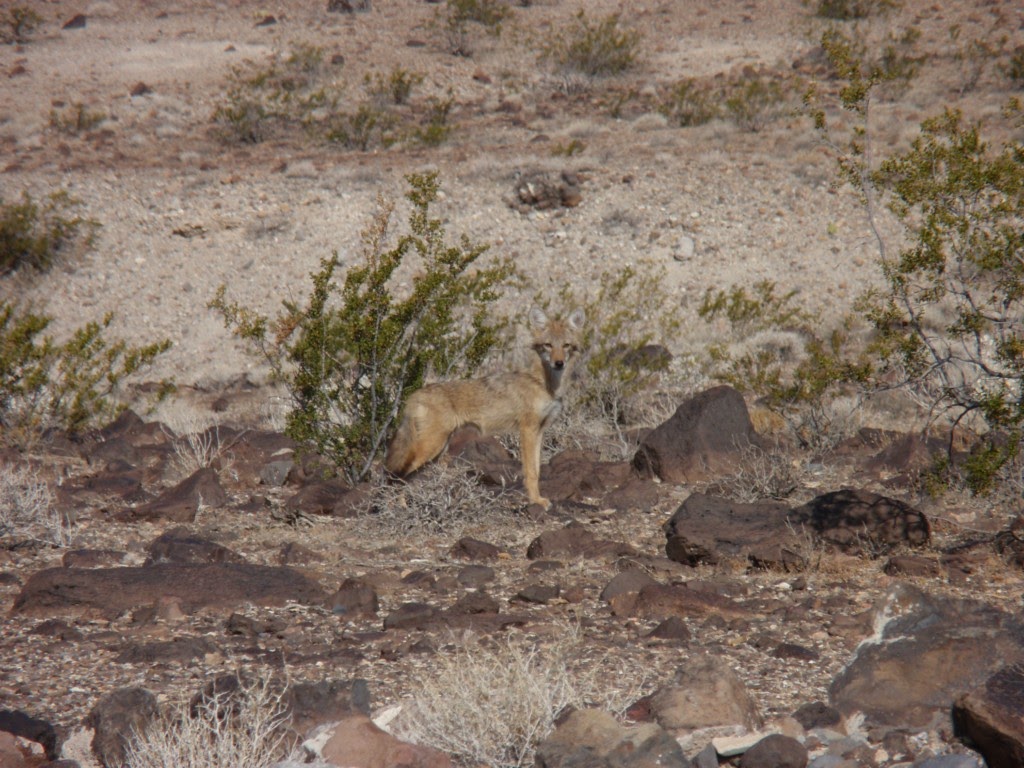 La faune n’est pas très visible de la route, mais j’ai bien vu sauter quelques souris du désert. J’aurais adoré voir un Grand Géocoucou courir en posant à peine ses pattes sur le sol brûlant, car c’est l’oiseau qui a inspiré à Tex Avery le célèbre héros de mon enfance Bip-Bip. Mais au moins, la consolation ce fut ce magnifique coyote, qui m’a tout de suite fait penser au héros précédent. Il se confond complètement avec le paysage, mais j’ai arrêté Alex car j’avais vu un truc bouger au loin !!