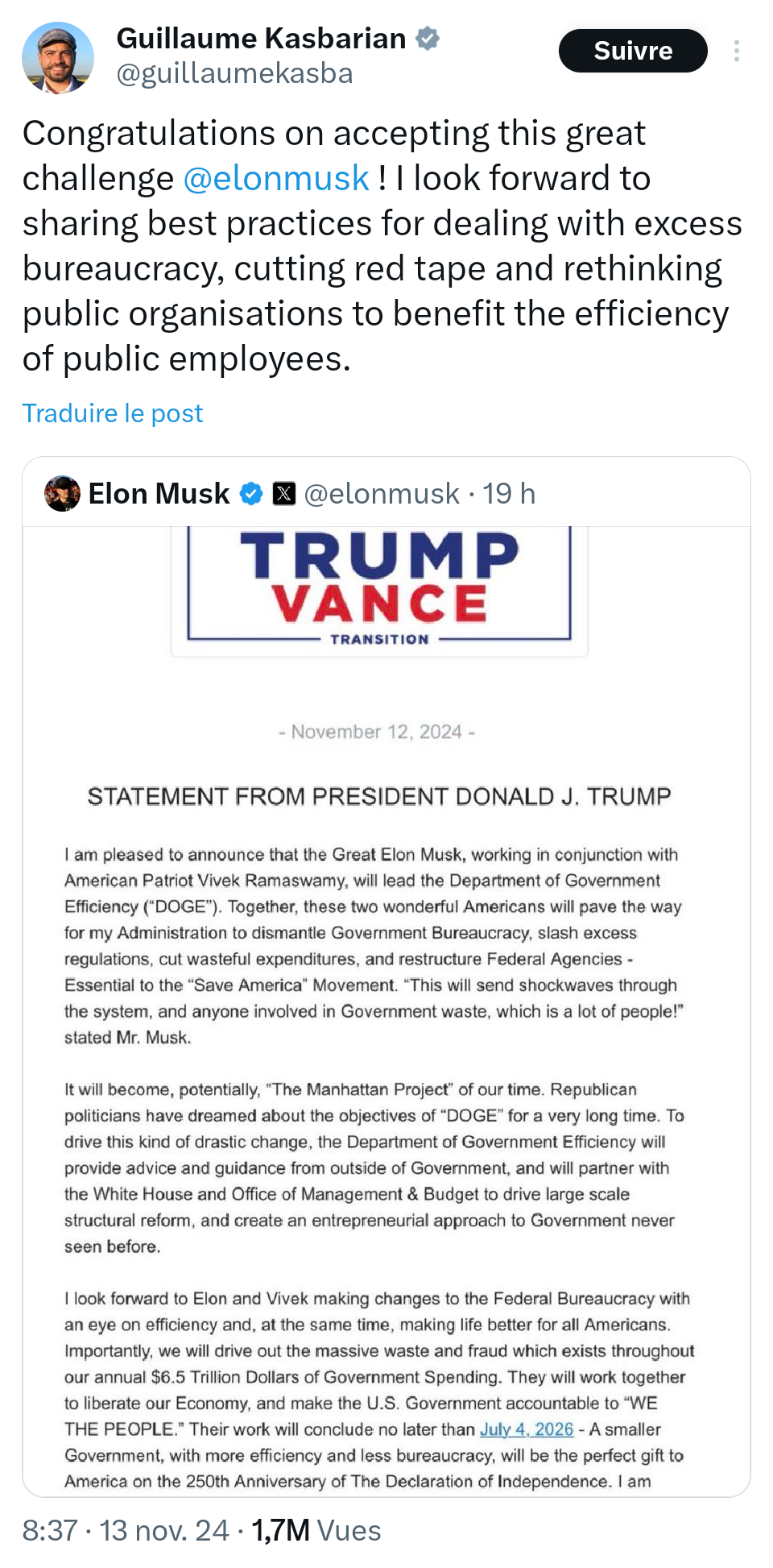 Mais qu’est-ce que c’est que ces nouvelles aujourd’hui ? D’abord, le ministre de la fonction publique qui salue publiquement l’arrivée de Musk dans le gouvernement de Trump. Et pour couronner le tout, il exprime sa hâte de partager les meilleures bonnes pratiques pour gérer l’excès de bureaucratie… Quand on connaît les idées nauséabondes et les pratiques professionnelles de Musk, on ne peut que vomir dans sa bouche en lisant cela.