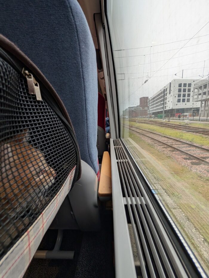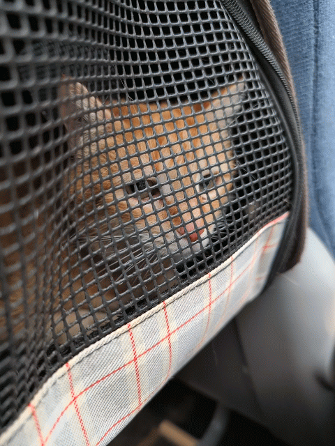 Regardez-moi cette petite malheureuse !! Et c’était un parcours très stressant pour elle avec le tramway, puis la gare et enfin le TER, puis la voiture jusqu’ à la maison. Mais bon, le chéri est à Clohars depuis dimanche dernier avec Sookie. Et moi je gardais Arya à Nantes. Et donc j’ai fait Nantes/Quimperlé en TER avec ma petite anxieuse, mais qui n’a pas miaulé à la mort au moins.