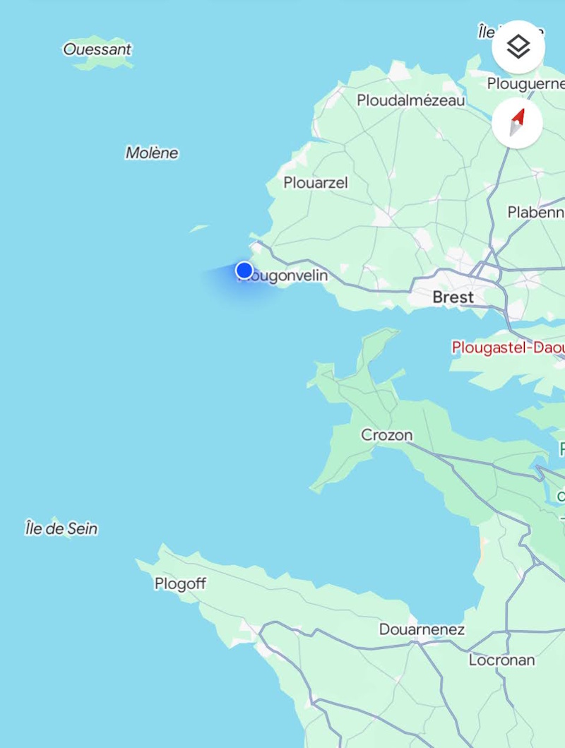 Et en effet, c’est très très joli comme endroit, et ces ruines d’abbaye sont splendides. On est en face de Molène et Ouessant qu’on pouvait très facilement apercevoir. Et comme montré sur la carte suivante, on avait une belle vue dégagée sur la pointe de Pen-Hir, son tas de pois, et l’iconique pointe du Raz.