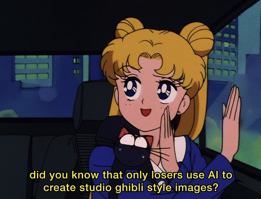Et même les critiques autour de la ghiblisation sont étranges. On dirait ma mère qui me disait « ooooh tu vas sur Internet et tu parles à des *gens* » avec un bel air de dégoût. Et puis c’est ridicule de remettre des citations de Miyazaki de 2016 à l’époque où l’IA produisait des montres humanoïdes qui se traînaient au sol… Et je suis circonspect aussi par rapport à ce qui est analogue à un filtre comme on en trouve depuis des années, mais qui sont aussi des sortes d’inspiration d’un style. Même si cela ne remet absolument pas en question la méthode d’origine : le vol. (J’ai lu un bon article à ce propos aujourd’hui.) Mais ça n’empêche que les métiers de l’écriture, du graphisme, de l’animation ou du cinéma sont tous en péril. La création ne va pourtant pas disparaître, mais elle va clairement diminuer et se raréfier pour certains domaines.